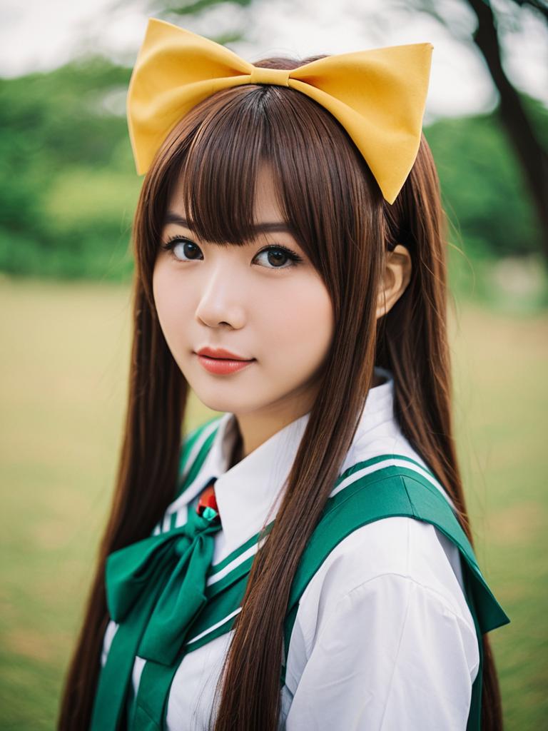 Photo-realistic cosplay photo of person in arima miyako costume. 1girl, green eyes, long hair, brown hair, hair bow, tangzhuanglifestyle stock photo, shallow depth of field, lifestyle stock photography, shallow depth of field, natural lighting, warm tones, soft background blur, candid moments, vibrant colors, realistic textures, modern casual clothing. full body shot