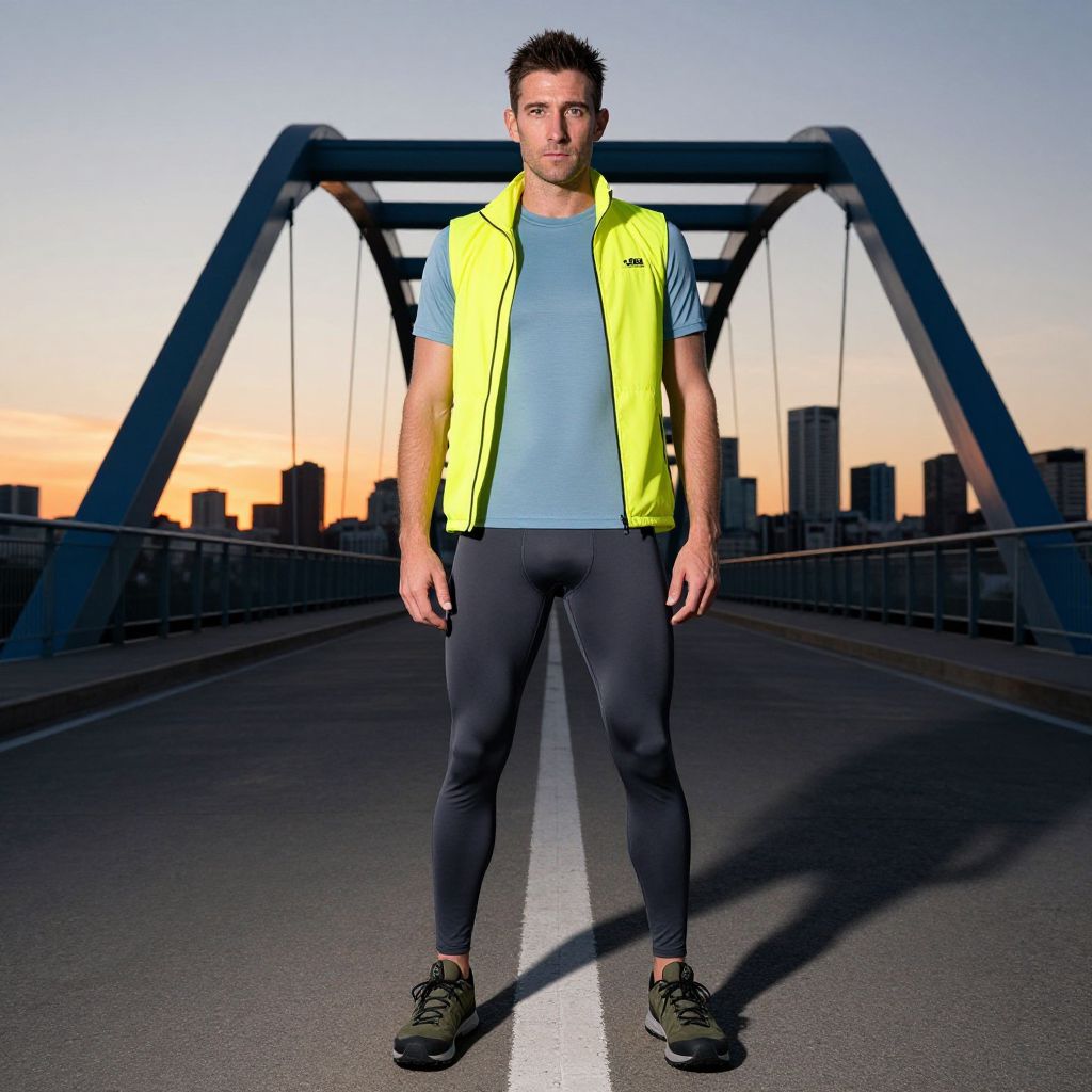 A man, thermal tights in dark gray, sleeveless vest in neon yellow, lightweight moisture-wicking t-shirt in light blue, trail-ready sneakers in olive green, modern steel arch bridge, city skyline in the background, vibrant sunset casting shadows, camera obscura style, focused expression Man has masculine face and piercing eyes