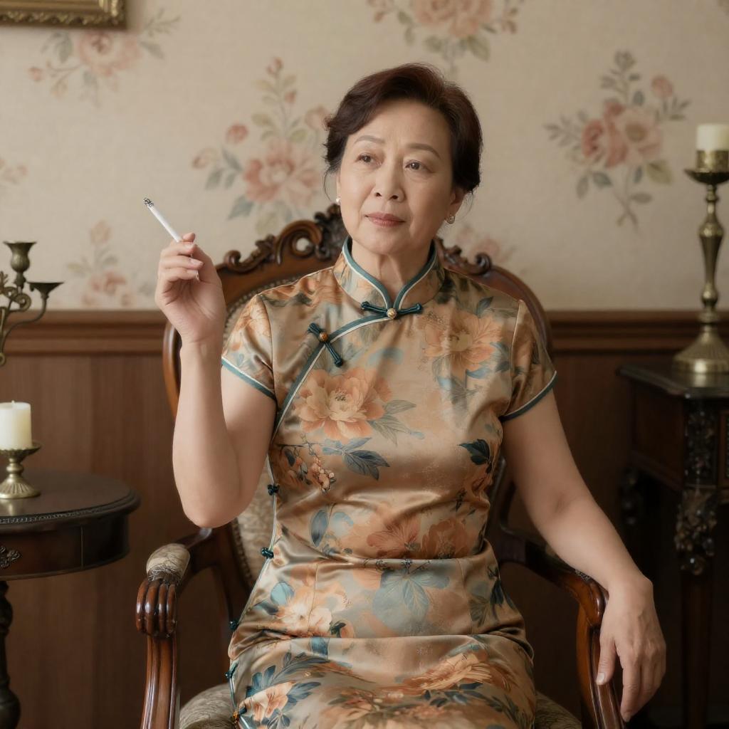 Middle-aged woman with dark hair in a traditional Chinese dress with floral patterns, holding a cigarette in her right hand, sitting on an ornate wooden chair. Background: floral wallpaper, decorative table, candle. Neutral expression. Indoor setting.