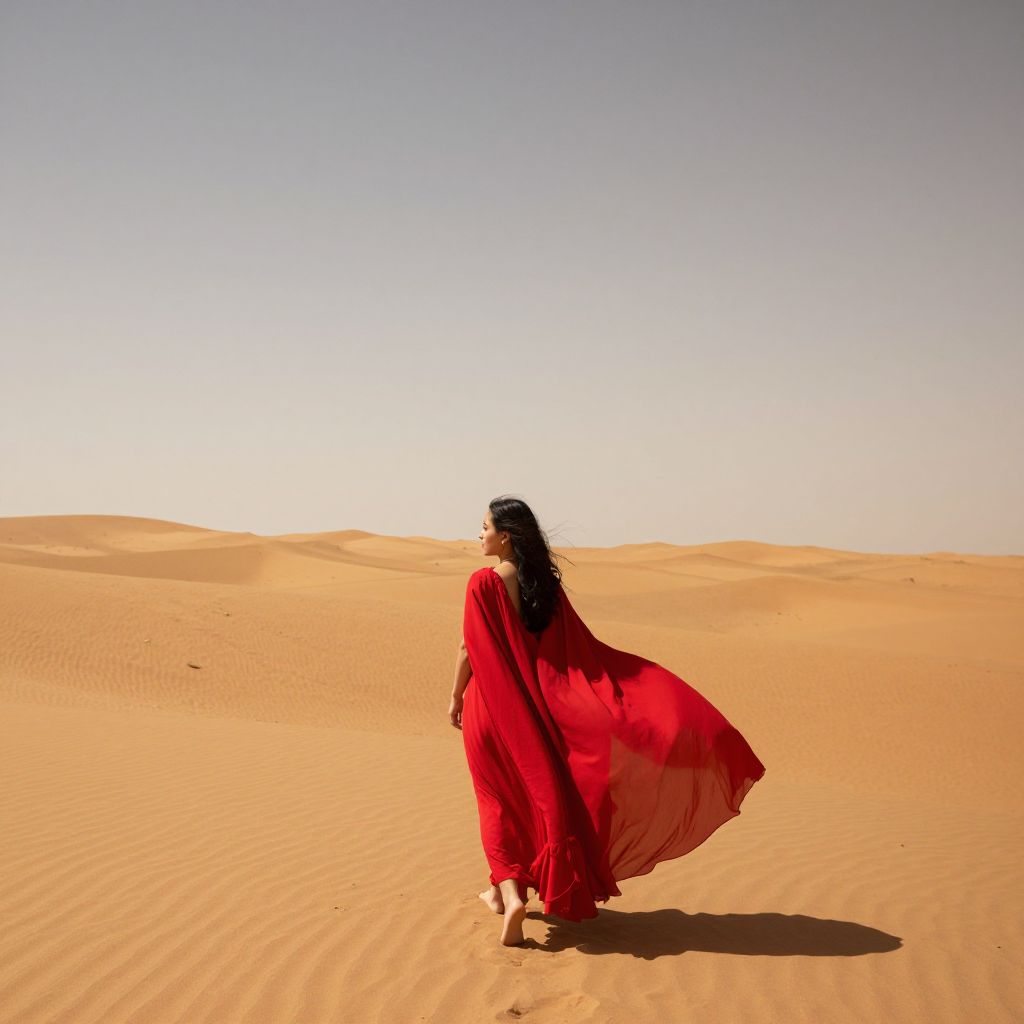 Photograph of a woman with long dark hair standing in a vast, sunlit desert with rippled sand dunes. She is wearing a flowing, vibrant red chiffon dress that billows in the wind, casting a shadow on the sand. Her profile is visible, facing left. The clear, blue sky meets the horizon, creating a stark contrast with the golden-orange desert. The woman's dress and the sand's texture are highlighted by the bright sunlight. There are no other objects or people in the image.