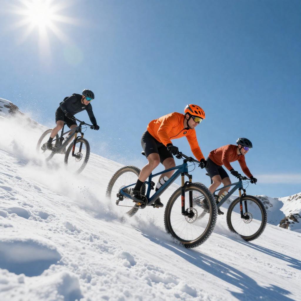 A dynamic photograph of three mountain bikers racing downhill on a snowy slope. They're dressed in bright orange and black gear, with helmets and goggles, creating a dramatic splash of white snow as they speed by. The background is a vivid blue sky with the sun shining brightly, adding a sense of action and speed.