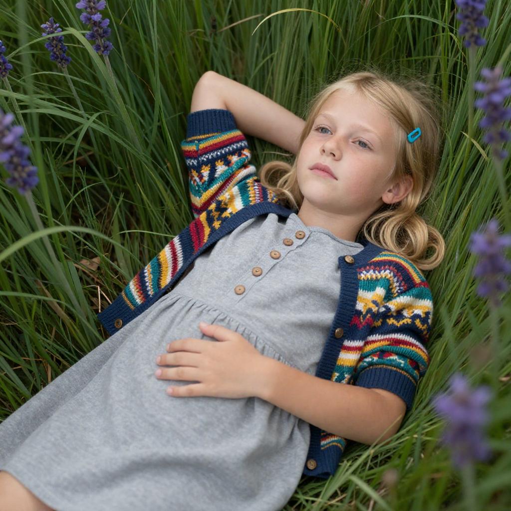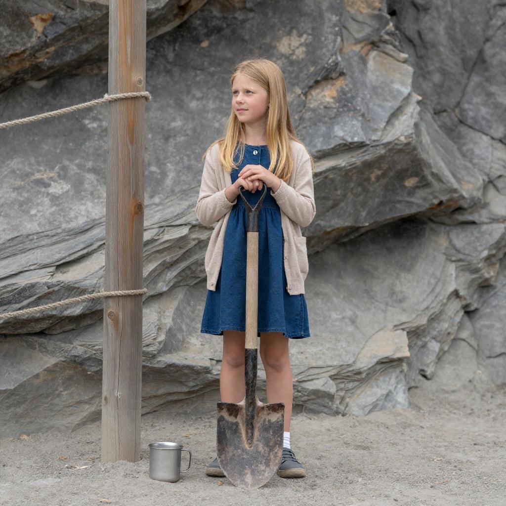 Young blonde girl with long hair wearing a beige cardigan and blue dress, holding a shovel, standing in front of a rocky hill. She is next to a wooden post with rope. A metal cup is on the ground in front of her. She looks slightly to the side. Rocky background with visible layers and ure. She is holding the shovel with both hands, standing upright. The scene is outdoors.