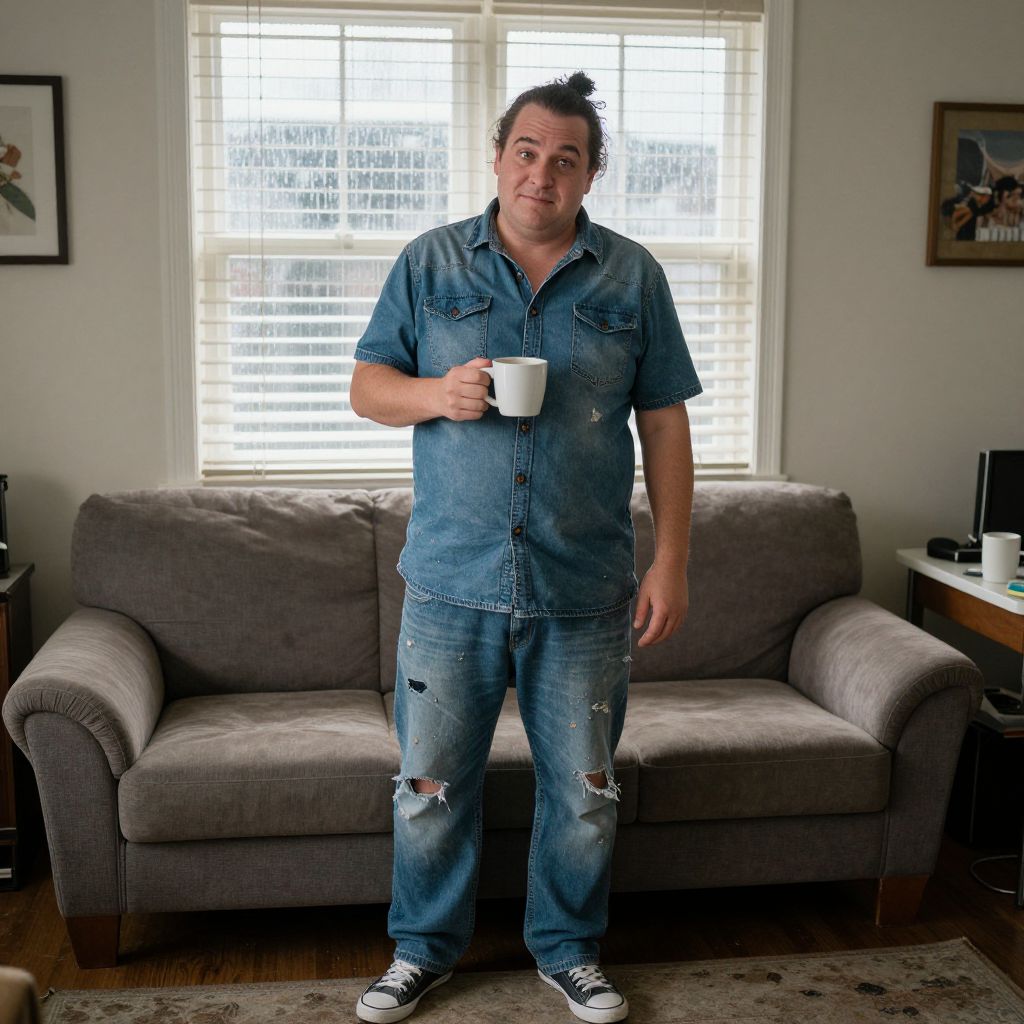 A man with tired eyes and a broad, friendly face stands in a worn-out apartment living room, dressed in distressed denim jeans covered in small patches and rips, sitting on a faded sofa with a coffee cup in hand, sunlight filtering through the blinds on a rainy afternoon.