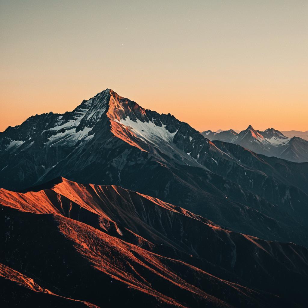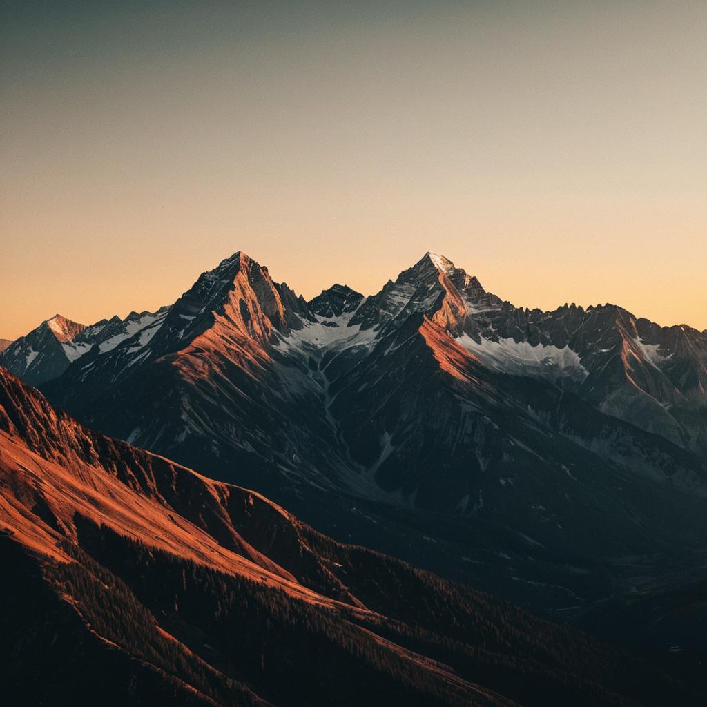 Photo-realistic digital art depicting a mountain range during sunset with earthy color tones. The peaks have patches of snow and are illuminated by warm sunlight, creating a contrast between the brightly lit and shaded areas. The image captures the natural beauty and tranquility of the mountainous landscape.