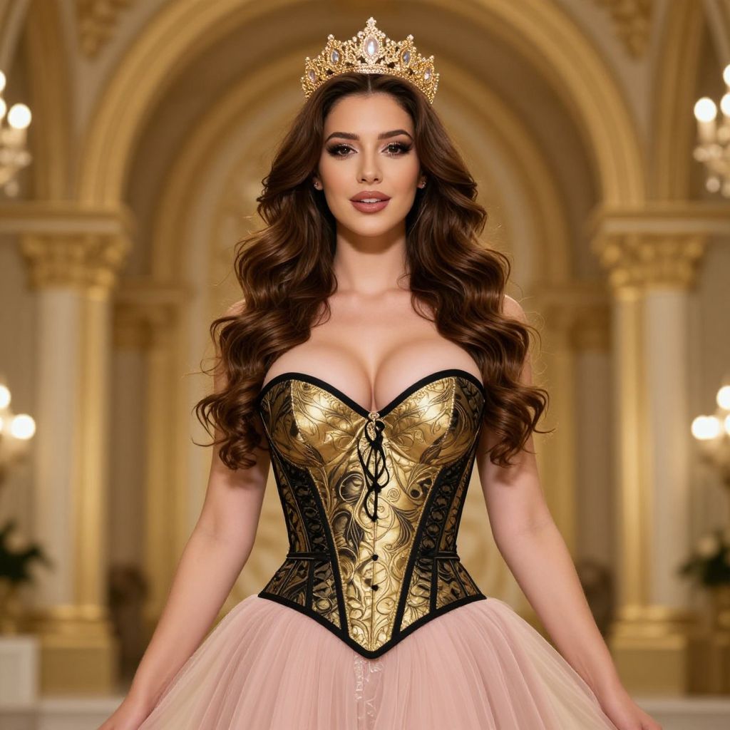 Photograph of a beautiful woman with long, wavy brown hair, wearing a gold crown and an elaborate gold and black corset with intricate patterns, over a pink tulle skirt. She stands confidently in the center of a grand, ornate hall with golden arches and soft, warm lighting. Her makeup is glamorous with dark eyeliner and pink lipstick, and her expression is poised and elegant. The background features blurred, golden pillars and chandeliers, enhancing the luxurious atmosphere. The image has a digital, fashion-show aesthetic.