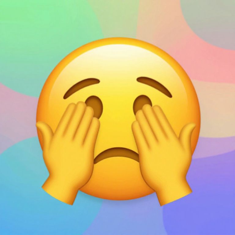 Digital emoji of a yellow, sad face with hands covering eyes, set against a gradient background of pastel blue, green, pink, and purple.