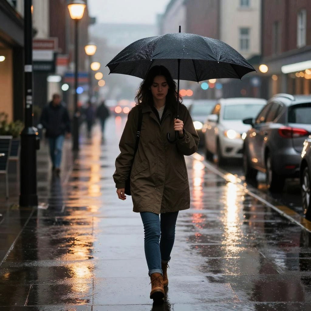 Girl with Umbrella on Rainy Street