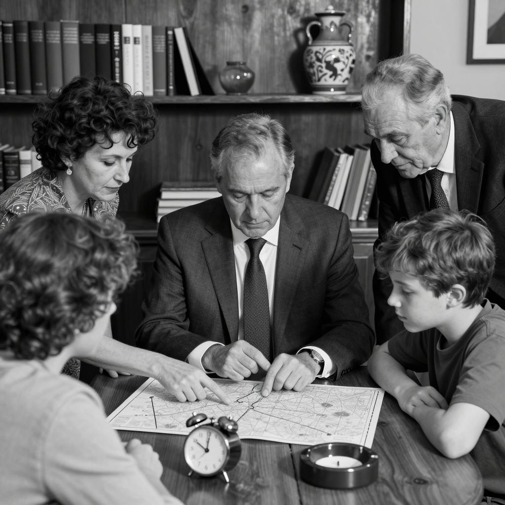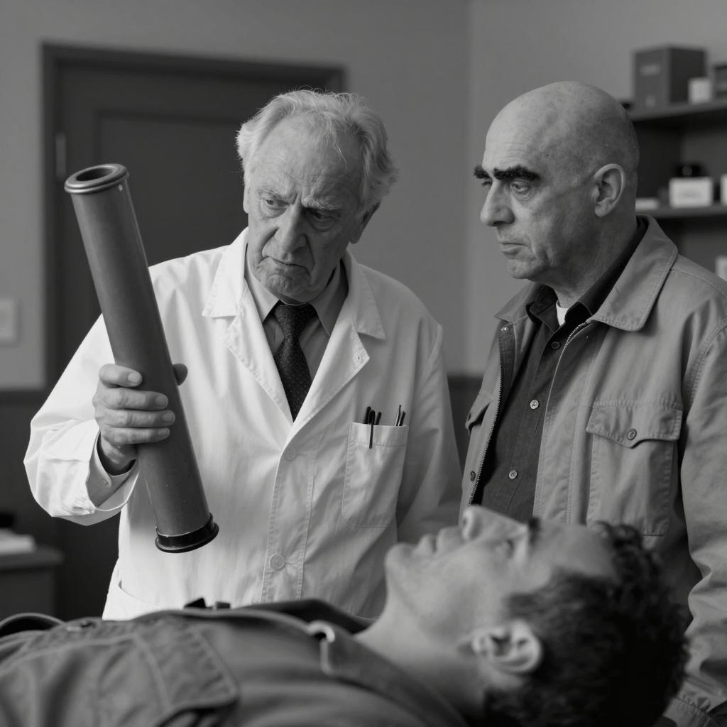 Black and white photograph of three men. Elderly man with gray hair, white lab coat, and dark tie holds a large cylindrical object in his right hand. Middle-aged man with bald head, thick eyebrows, and light-colored jacket looks at the object. Unconscious man with helmet lies in the foreground. Background has a door and shelves. Elderly man's expression is intense. Middle-aged man's expression is neutral. Unconscious man's face is obscured.