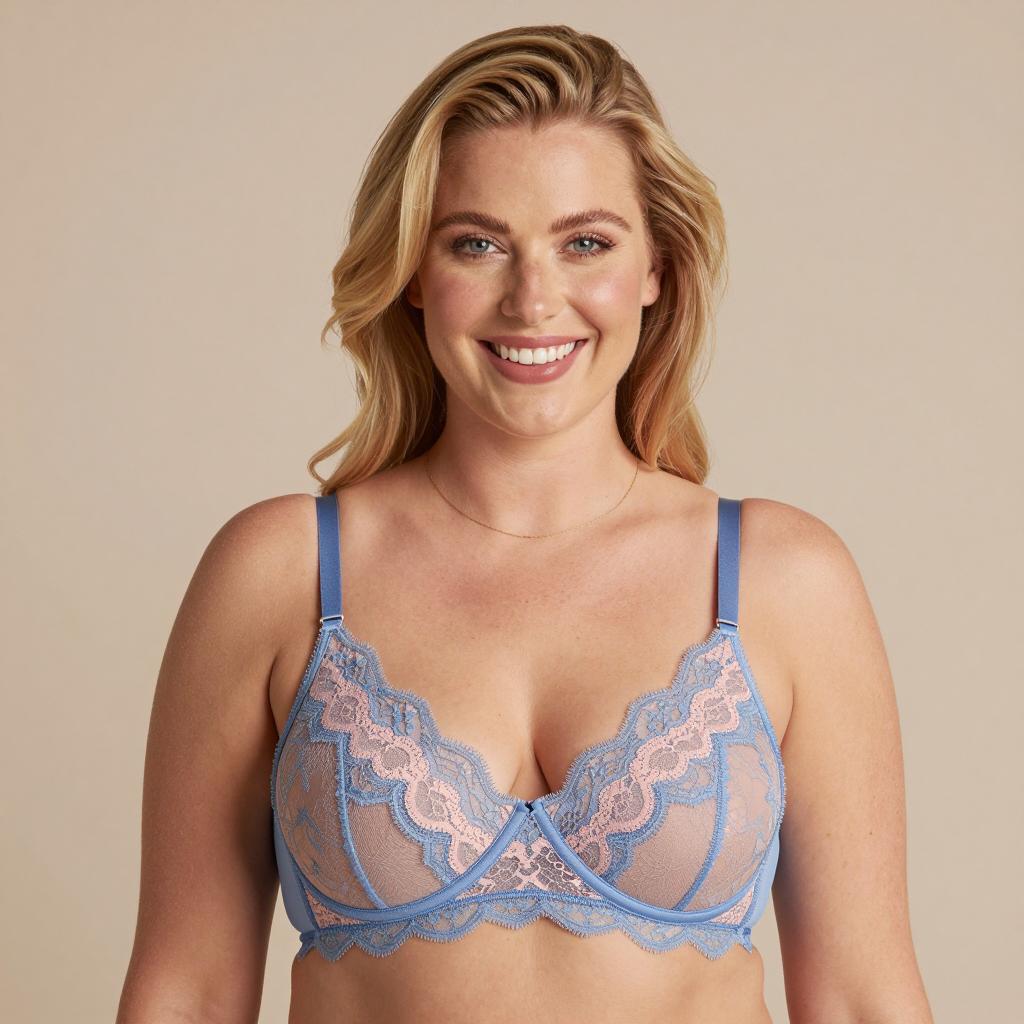 Smiling Blonde Woman in Blue and Pink Lace Bra