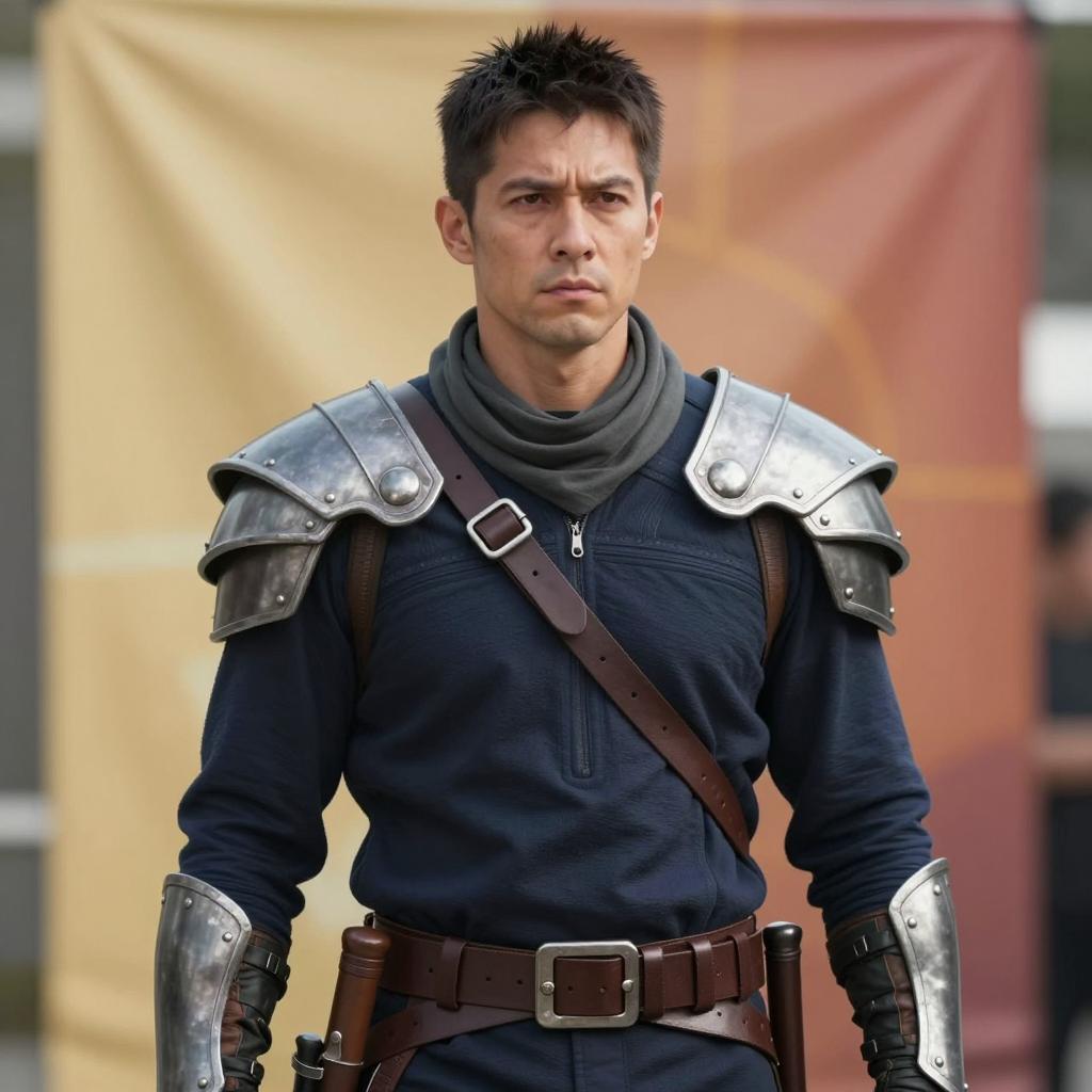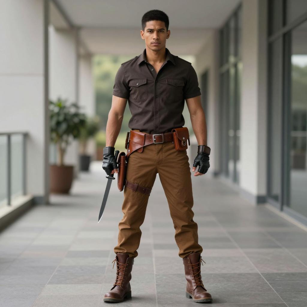 Rambo costume man, photorealistic, male character, standing, full body, dark brown short-sleeve shirt, brown pants, brown boots, brown leather belt with pouch, brown leather satchel, fingerless gloves, black gloves, short black hair, dark skin, serious expression, modern urban hallway background, blurred potted plant in background, holding black knife in right hand, realistic lighting, subtle shadows, casual yet rugged outfit, stylish and functional, outdoor adventurer, modern fantasy character design, realistic ures, detailed clothing, medium shot, centered composition, balanced light and shadow
