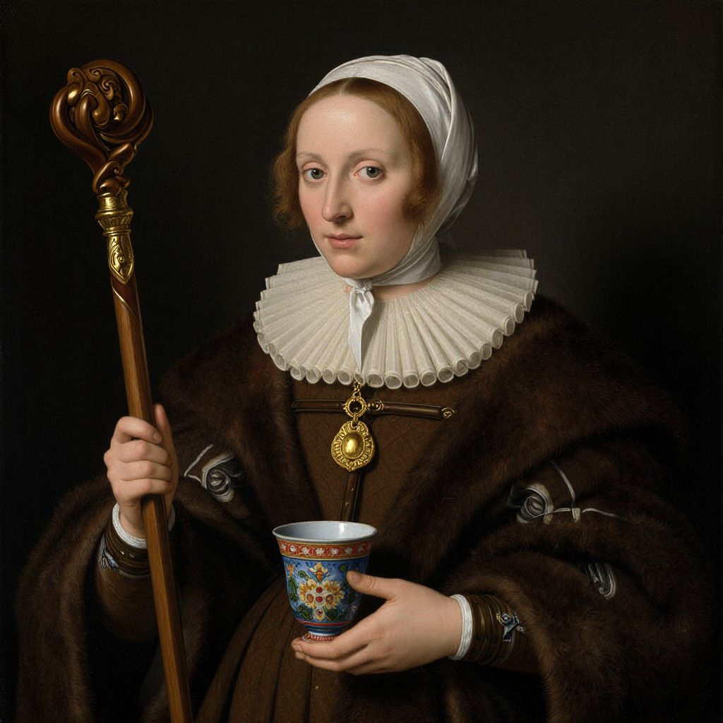 Photograph of a 16th-century portrait featuring a fair-skinned woman with light brown hair, covered by a white headdress. She wears a brown, fur-trimmed dress with intricate white lace at the neckline and holds a wooden staff adorned with a gold circular medallion in her left hand. Her right hand holds a blue and white ceramic cup with a red emblem. The dark background highlights her detailed, ornate attire and serene expression. The style is reminiscent of Northern Renaissance portraiture, emphasizing realism and fine detail.