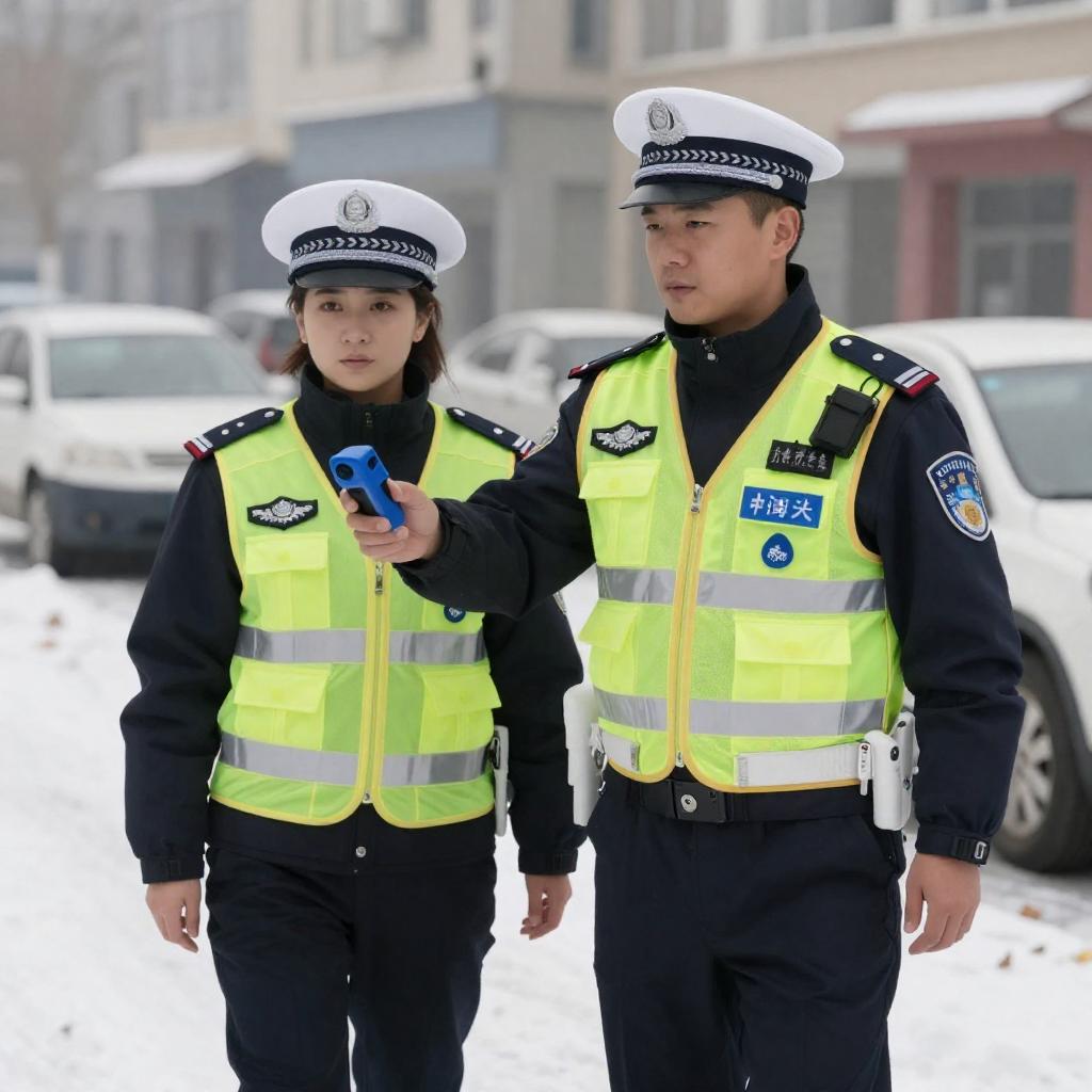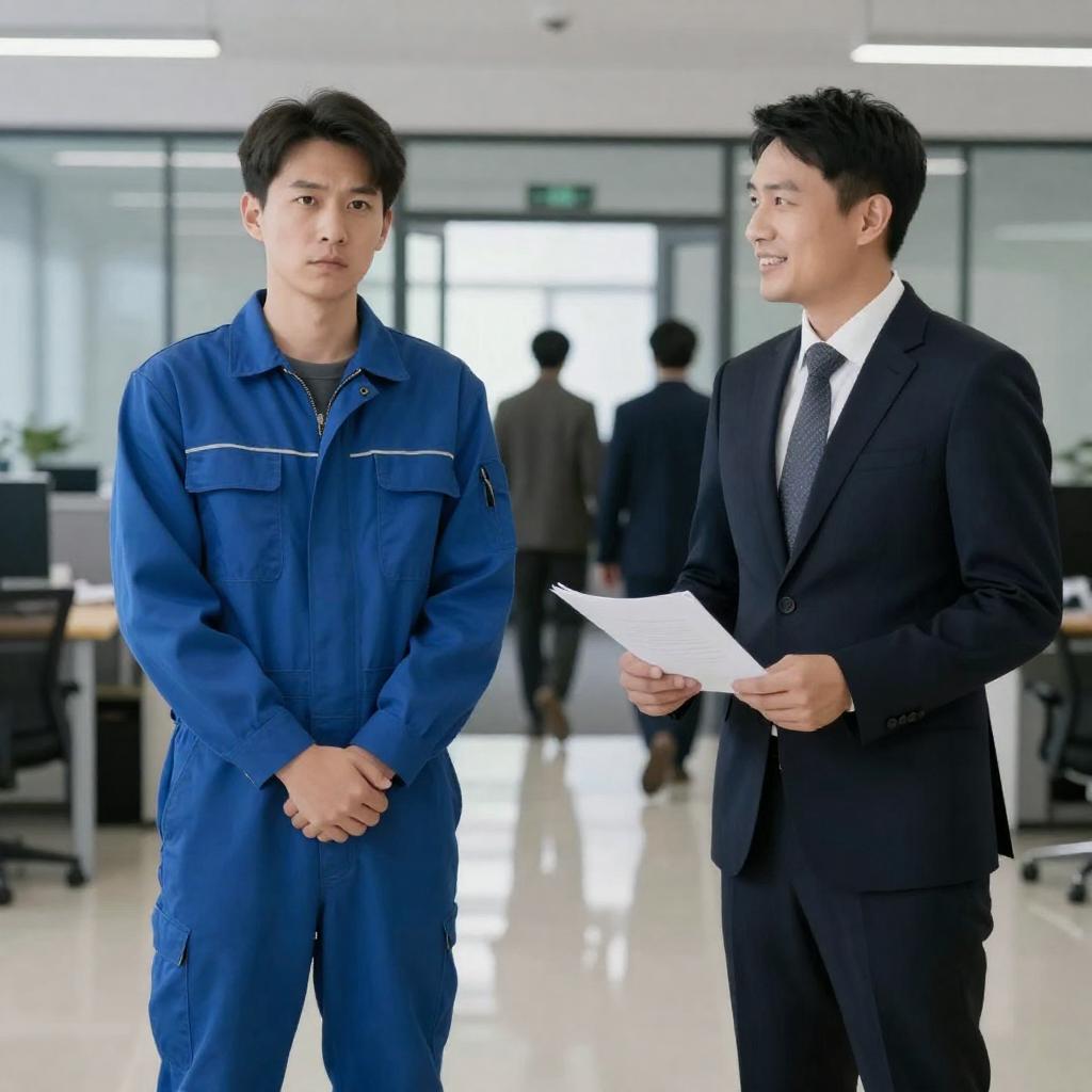 Two people in yellow hard hats and work clothes walk outside an old, weathered building with a red-tiled roof. The man in white overalls gestures forward, while the woman in brown overalls looks ahead. Snow on the ground.