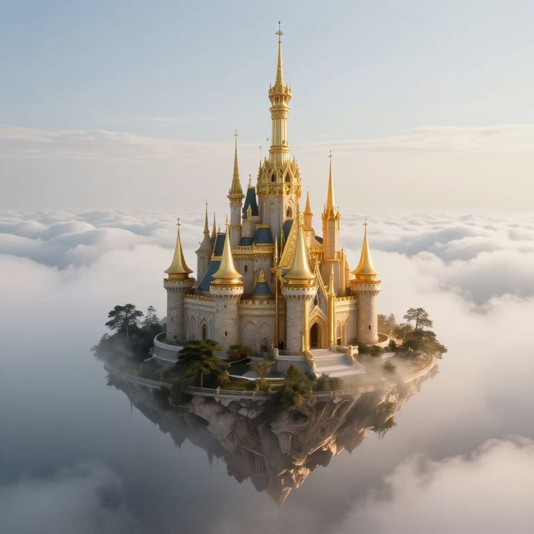 A majestic, golden castle floats serenely atop a circular island suspended in the clouds, its spires piercing the ethereal mist as if defying gravity in a realm where the boundaries between earth and sky dissolve into a dreamlike tapestry.