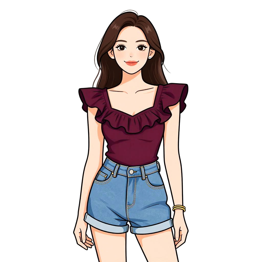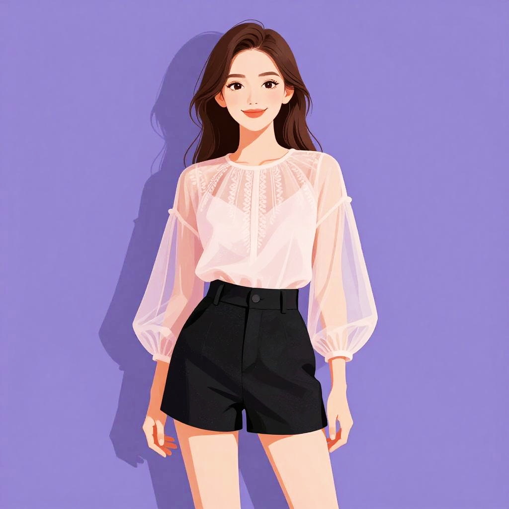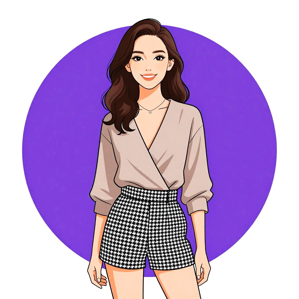 Woman with pretty face and pretty hair. Woman, classic, white blouse with a gathered neckline, long sleeves with gathered cuffs, gold chain necklace with white beads, tailored burgundy shorts, beige shoulder bag with gold chain strap. --sref 1467