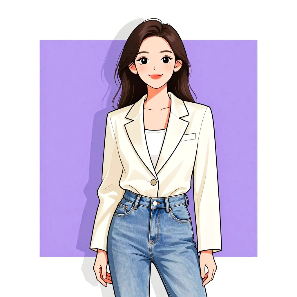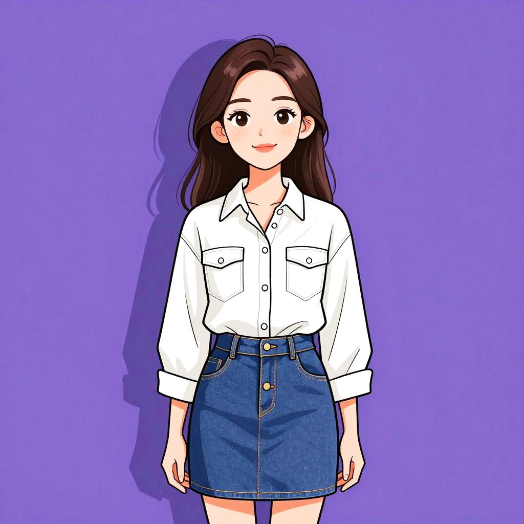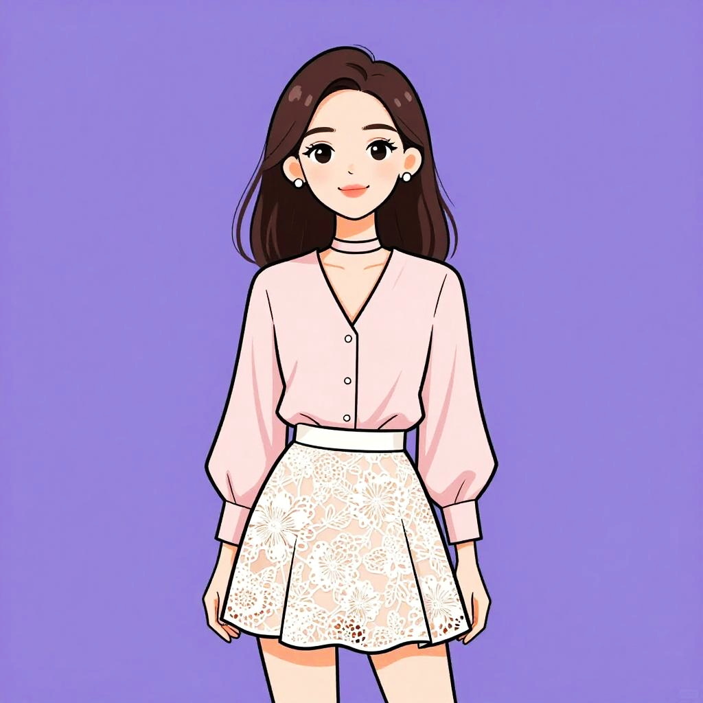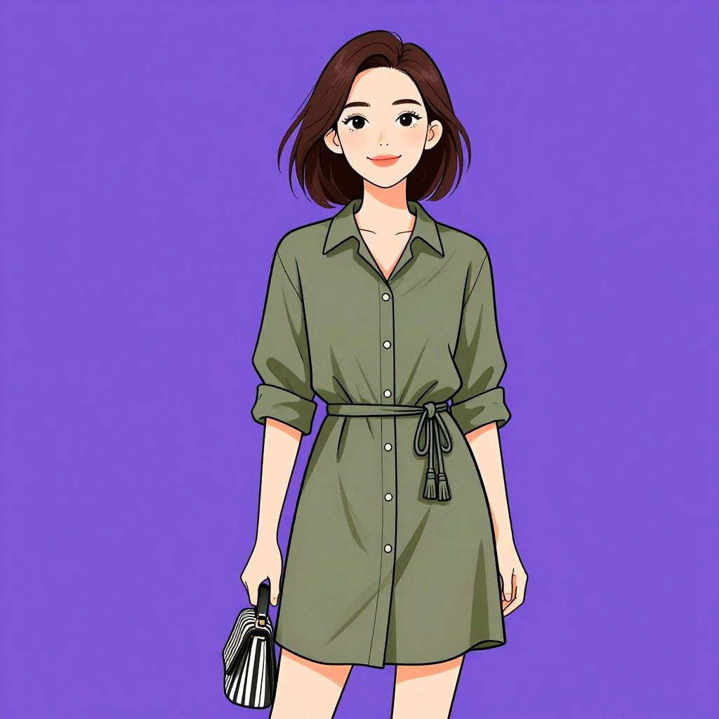 Woman with pretty face and pretty hair. Woman, classic, white blouse with a gathered neckline, long sleeves with gathered cuffs, gold chain necklace with white beads, tailored burgundy shorts, beige shoulder bag with gold chain strap. --sref 1467