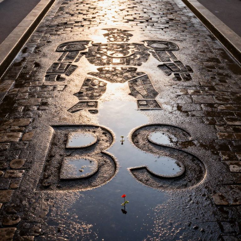 Photograph of a wet cobblestone pavement reflecting sunlight, with the large, raised, black letters "RBBS" prominently displayed. The cobblestones are uneven and textured, with a slight sheen from the water. A small red flower is visible in the reflection near the bottom center. The background shows a narrow, asphalt path on either side of the cobblestone area. The lighting creates a bright, almost mirror-like effect on the wet surface, enhancing the reflection of the letters. The image has a high contrast, emphasizing the textures and reflections.