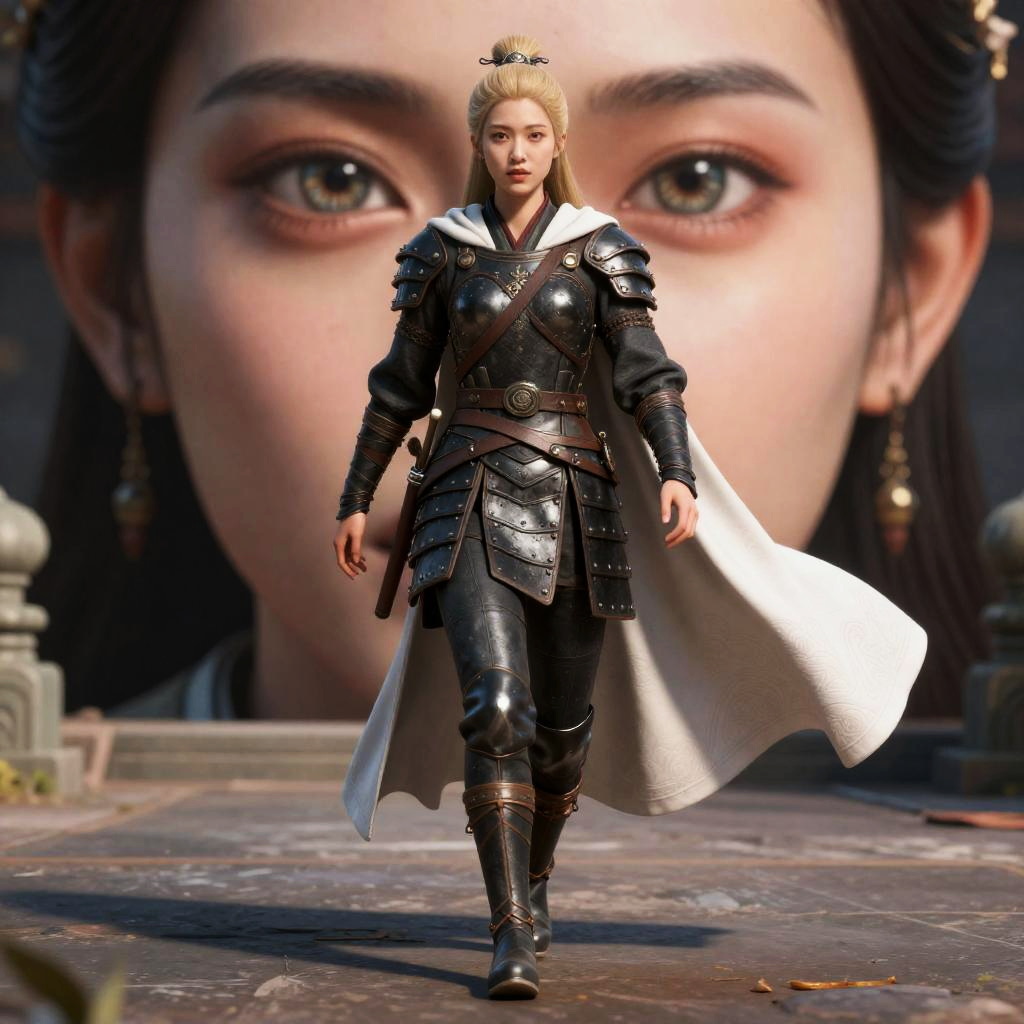 (((realistic))) canon 5d, masterpiece, highest quality, 4k, 8k, 16k, ultra high-res, raw photo in hdr, sharp focus, hyper realistic, lifelike texture, intricate face, intricate eyes, high contrast, skin imperfections, subsurface scattering, f2, depth of field, film grain, a photograph of full body, walking pose, slow motion, (rogue thief:1.2) female wearing full body multiple stitched layer (leather armor:1.2), (white silk cloak), (fabric with intricate pattern:1.2), (bloom:1.5), (analog:1.2), (detailed pupils:1.1), (long dark blonde Hair, ponytail haircut, ecstatic:1.1), (young woman:1.1), sharp, (perfect body:1.1), real shadow, 3d, (asian temple background:1.2)
