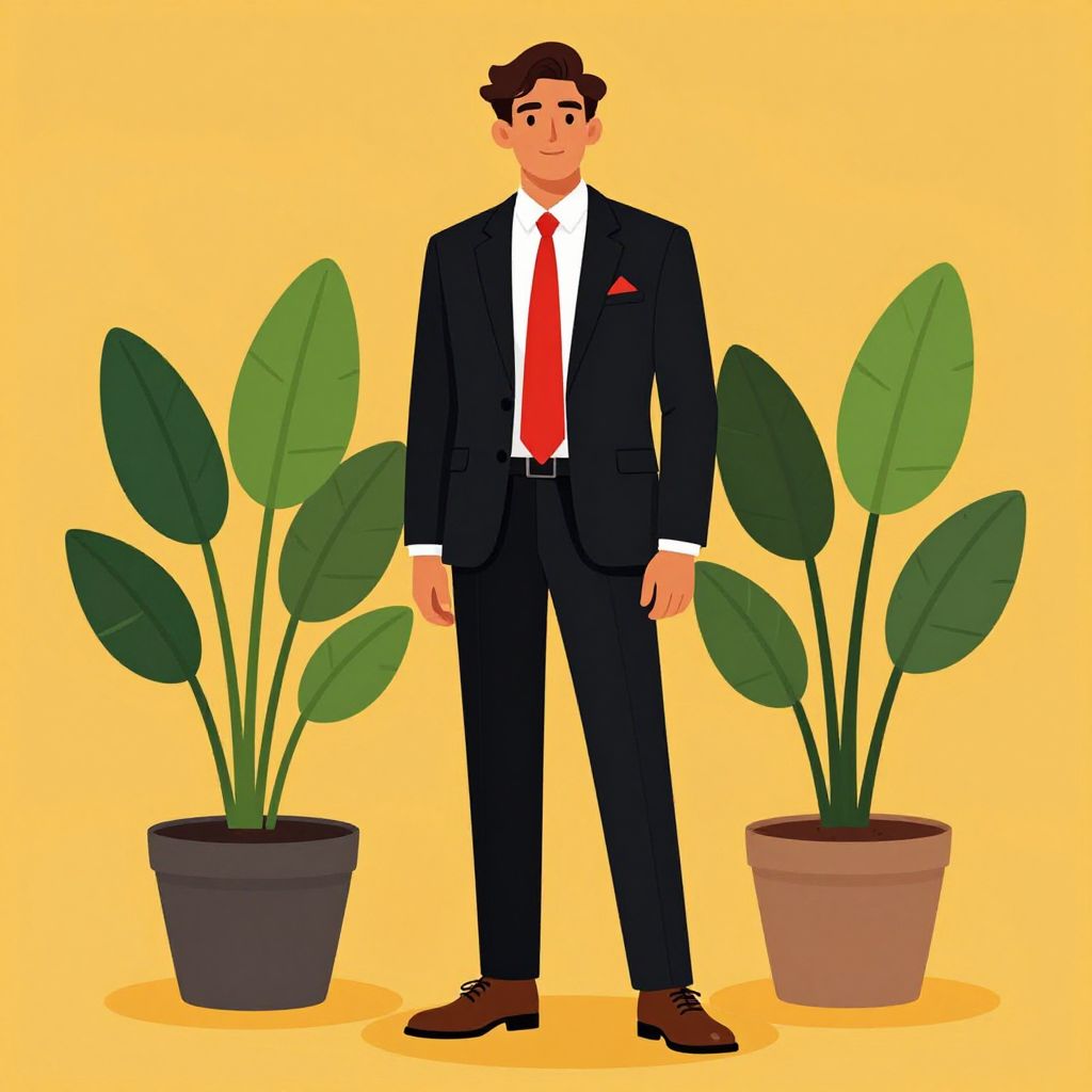 This is a digital watercolor-style drawing of a young, Caucasian man with short brown hair and a fair complexion. He is dressed in a dark blue suit jacket, white dress shirt, and green tie, with brown pants and black belt. His right hand is in his pocket while he looks down at a small green tree with a thick trunk, planted in dark soil. The background features a simple, light green landscape with some grass and distant trees, all rendered in soft, pastel colors. The overall style is whimsical and slightly cartoonish.