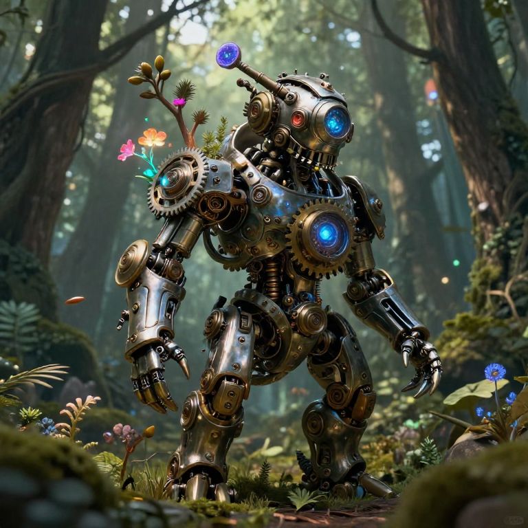 A CGI digital artwork depicts a metallic, steampunk-style humanoid robot standing in a lush, sunlit forest. The robot has intricate gears, blue and red glowing eyes, and metal limbs. It's adorned with colorful flowers, including a pink blossom on its left shoulder and a blue flower on its right arm. The forest background features tall trees, sunlight filtering through the canopy, and a variety of greenery and small plants on the forest floor. The robot's shiny, metallic surface contrasts with the organic textures of the forest. The scene blends science fiction and nature in a vibrant, detailed illustration.