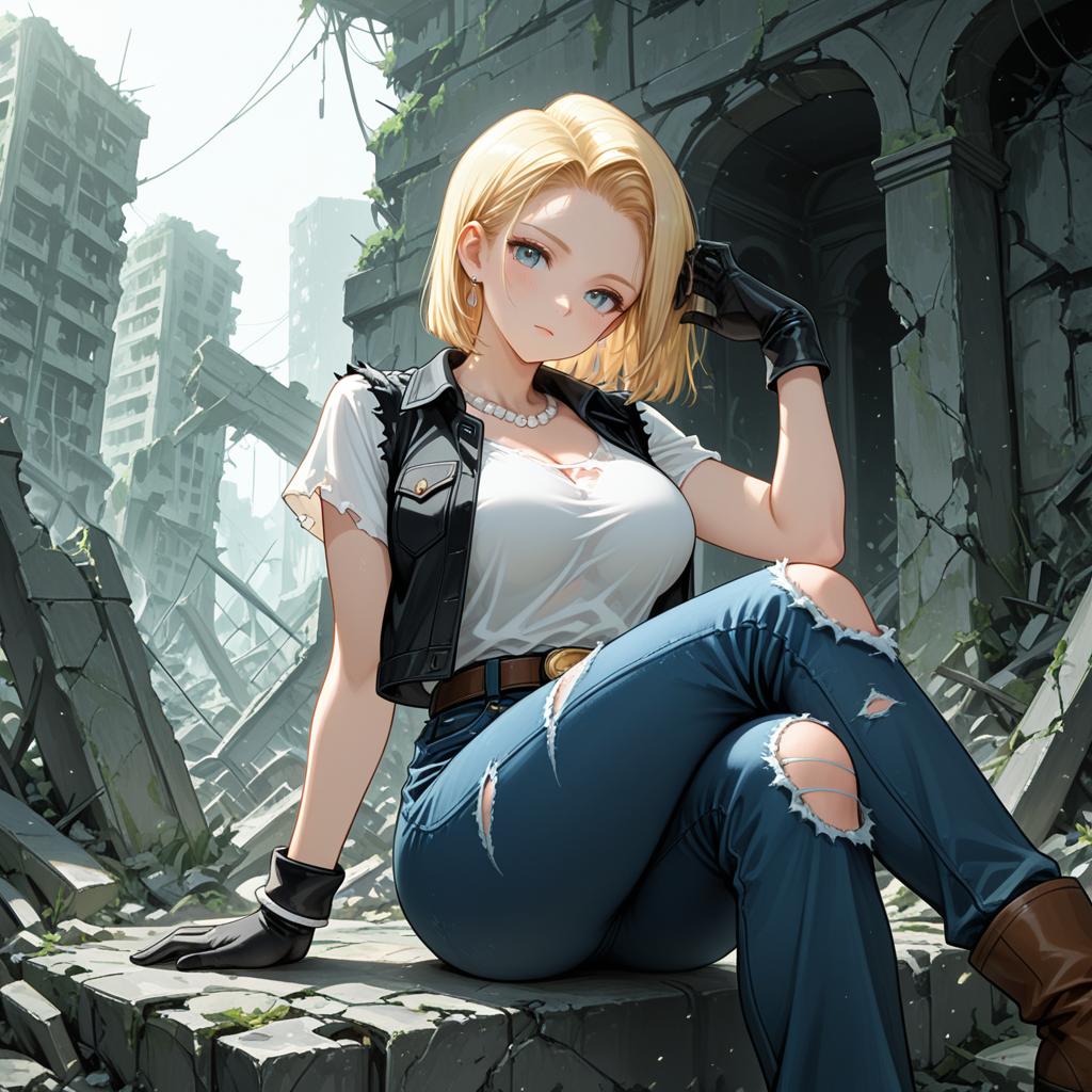 Best quality, highres, and18, 1girl, android 18, solo, blonde hair, blue eyes, belt, jeans, pearl_necklace, bracelet, black gloves, white shirt, short hair, short sleeves, earrings, blue pants, open vest, black vest, large breasts, (ruins:1.3), (torn clothes:1.5), sitting, expressionless, crossed legs
