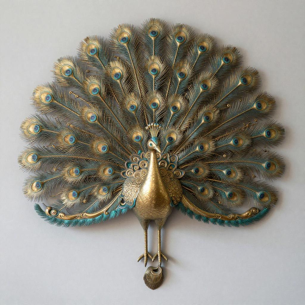 A decorative wall-mounted sculpture depicting a stylized peacock with an elaborate fan of feathers. The sculpture features metallic gold and teal colors, with intricate detailing in the feathers and head. The peacock's tail is represented with ornate swirls and feather motifs, highlighting artistic craftsmanship.