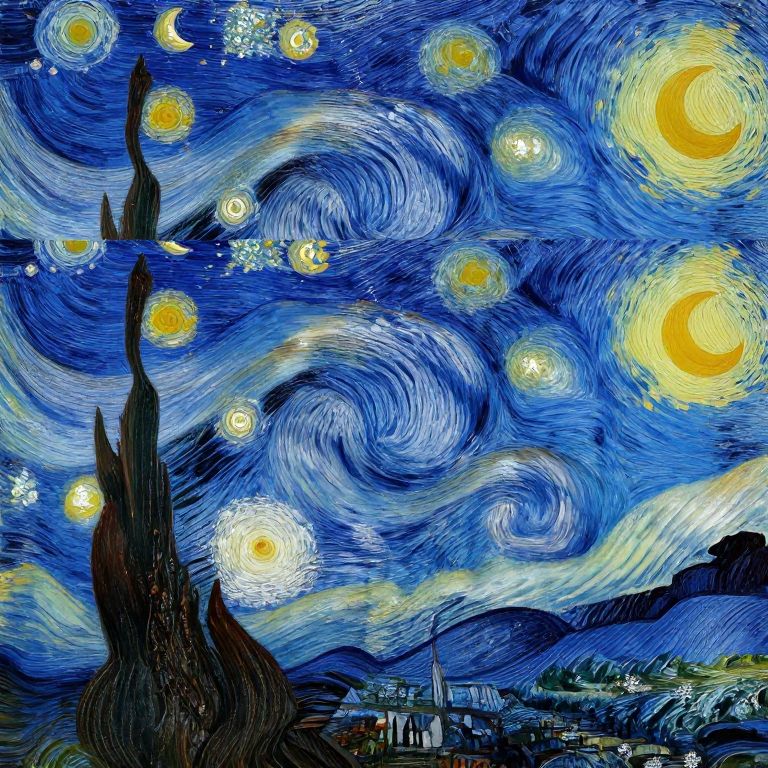 Vibrant digital painting of Vincent van Gogh's "Starry Night" with swirling blue skies, bright yellow stars, and crescent moons,