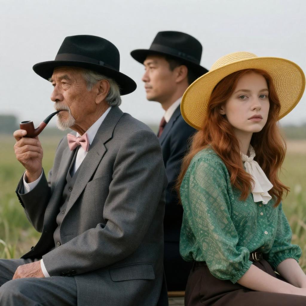 Three people sitting in a grassy field, positioned back-to-back. An elderly man with gray beard wearing a black hat, gray suit, white shirt, and pink bow tie smokes a pipe. A middle-aged man with black hair wears a black hat and dark suit. A young woman with long red hair wears a large yellow straw hat, green patterned blouse with a white ruffled collar, and dark pants. The background is an open grassy field under a pale sky.