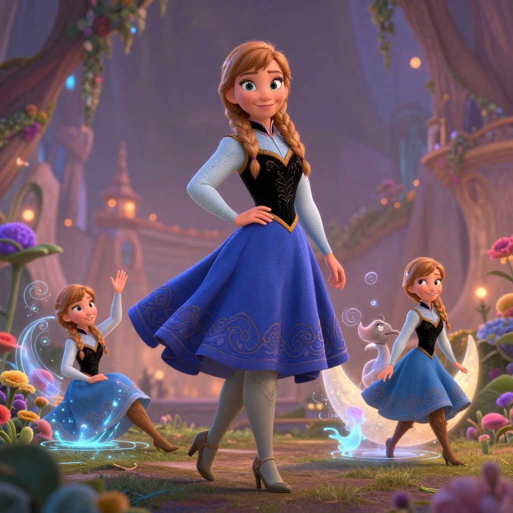 (official art, Disney-like animation style, high detail)>, soft and warm lighting reminiscent of Disney's magical hour, (sharp), exposure blend, bokeh, (hdr:1.4), medium contrast, (cinematic), (vibrant colors, warm tones:1.3), medium saturation., (ultradetailed, characterful expressions, 4k, best quality, masterpiece, perfect face, perfect Disney body proportions, beautiful and aesthetic:1.2, colorful, highest detailed face), ., General Image Attributes:, - Visual Quality and Resolution: High-resolution imagery to capture the fine details of Anna├в┬А┬Щs attire and the magical, fantastical setting around her., - Style and Realism: A blend of Disney├в┬А┬Щs animation style with a touch of realism, bringing the magical fantasy fairytale to life while keeping Anna├в┬А┬Щs character authentic., - Lighting and Atmosphere: Enchanting and ethereal lighting that casts a dreamlike glow over Anna, emphasizing the magical and fairytale elements of the scene., - Perspective and Composition: Artistic angles that highlight Anna├в┬А┬Щs legwear and high heels, integrating her fully into the magical fairytale setting., - Naturalism and Authenticity: True to the essence of Anna├в┬А┬Щs character from Disney, with an added layer of magical fantasy and fairytale charm., Character:, 1. Physical Details: Anna├в┬А┬Щs characteristic auburn hair, green eyes, and freckles, enhanced with an ethereal beauty fitting a magical fantasy setting., 2. Pose: 1. Standing confidently with one hand on her hip, the other gracefully touching her legwear, 2. Mid-twirl, showcasing her flowing skirt and detailed legwear, 3. Gently stepping forward, as if walking on air, with magical creatures following., 3. Emotion/Expression: 1. A radiant smile reflecting joy and wonder, 2. A look of awe at the magical surroundings, 3. A playful wink to a passing mythical creature., 4. Actions: 1. Casting a gentle spell with a wave of her hand, animating the flora around her, 2. Dancing with woodland sprites, her movements causing ripples of magic, 3. Sitting on a moonlit bench, her legwear and heels subtly illuminated by magical light., Attire:, - Iconic Attire: 1. A gown that subtly shifts colors, adorned with patterns that seem alive, 2. A modern twist on her classic dress, enhanced with magical symbols and motifs., - Topwear: A bodice that sparkles under the enchanted forest├в┬А┬Щs canopy, detailed with delicate magical embroidery., - Bottomwear: A flowing skirt that moves with a life of its own, hinting at hidden enchantments., - Legwear: 1. Sheer tights embellished with silver threads that glow softly in moonlight, 2. Elegant lace stockings with patterns of mythical creatures and enchanted forests., - Footwear: 1. High heels made from enchanted wood, adorned with leaves that flutter with her movements, 2. Crystal slippers that shine with internal light, casting soft glows with every step., - Outerwear: A cloak that shifts from translucent to opaque, wrapped in a mist of magic., - Headwear: A crown of flowers that bloom eternally, interwoven with tiny, glowing gems., - Accessories: A magical amulet that pulsates with an inner light, guiding Anna on her journey., - One-piece/Full-length Wear: A dress that encapsulates the essence of the northern lights, ever-changing and mesmerizing., - Specialty Items: A book of spells, bound in ethereal fabric, always at her side., - Jewelry: A set of bangles that chime with a melody known only to the ancient protectors of the realm., - Hairstyle: Loose braids adorned with magical beads that change color to match her mood and setting., Attire Details:, - Materials and Fabrics: Ethereal weaves that seem to float around Anna, creating an aura of mystique and elegance., - Design Details: Intricate lace and embroidery, featuring symbols and creatures from fairytales and magical lore., - Colors and Patterns: A palette that reflects the fantastical ├в┬А┬У vibrant hues that shift and shimmer with Anna├в┬А┬Щs movement and the magical landscape., - Style and Fit: Tailored to enhance Anna├в┬А┬Щs silhouette, the attire merges royal elegance with the whimsy of a fairytale adventure., Setting Details:, - Settings: 1. A secluded glen under a canopy of starlight, 2. A grand ballroom lit by enchanted chandeliers, 3. A mystic garden where flowers sing at dusk, 4. A bridge spanning a river of liquid light., - Time of Day: Twilight, when the veil between worlds thins and the magic of the fairytale realm becomes most palpable., - Mood: A blend of awe and serenity, as if stepping into a living dream where every moment holds a new wonder., - Weather: A gentle mist that wraps the scene in a soft embrace, making the magical elements stand out even more., - Seasonal Elements: An evergreen world where the seasons meld, showcasing the best of each in a perpetual fairytale spring., - Effects: Glittering trails that follow Anna, marking her passage through the magical realm with sparkles of light and color., - Lighting and Shadow: Soft, diffuse light that enhances the ethereal beauty of the scene, with shadows that playfully hint at hidden magic., - Environment Effects: Flowers that turn to face Anna as she passes, and trees that whisper secrets of ancient magic., - Color Grading: A vibrant yet soft palette that brings the magical fantasy fairytale to life, highlighting the whimsical and ethereal aspects of the scene., Stable Diffusion is encouraged to choose from these suggestions at random, combine them, or explore beyond these choices if another option better suits the character's authenticity or the image's overall vision. Ensure the choices made result in a cohesive and coherent scene. Stable Diffusion should integrate the character into the scene perfectly taking into account all environmental effects on her surroundings, attire, and character., extreme detailed, highest detailed)