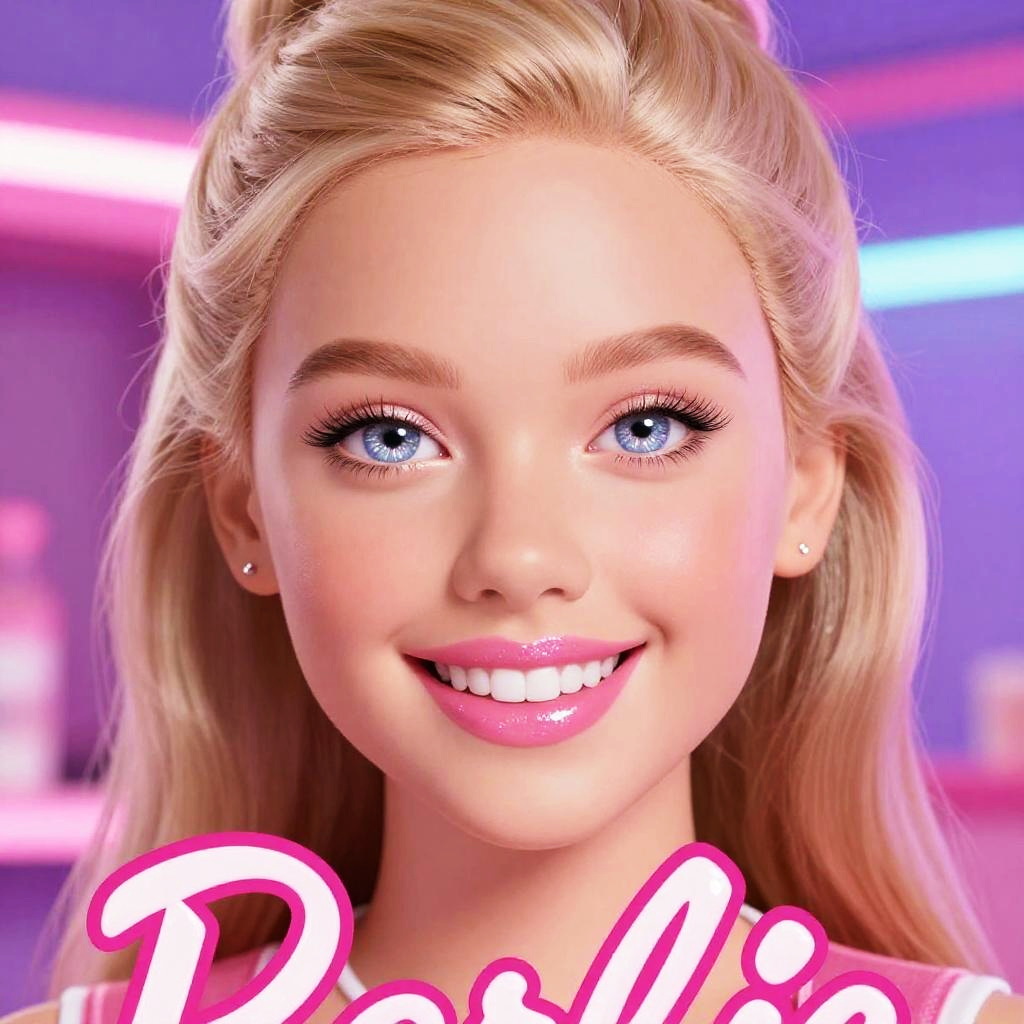 A close-up of a smiling girl using Barbie filters, featuring smooth glowing skin, oversized sparkling eyes, and shiny bubblegum pink lips, with a backdrop of glossy pink and purple neon lights, capturing a fun and trendy digital makeover vibe.