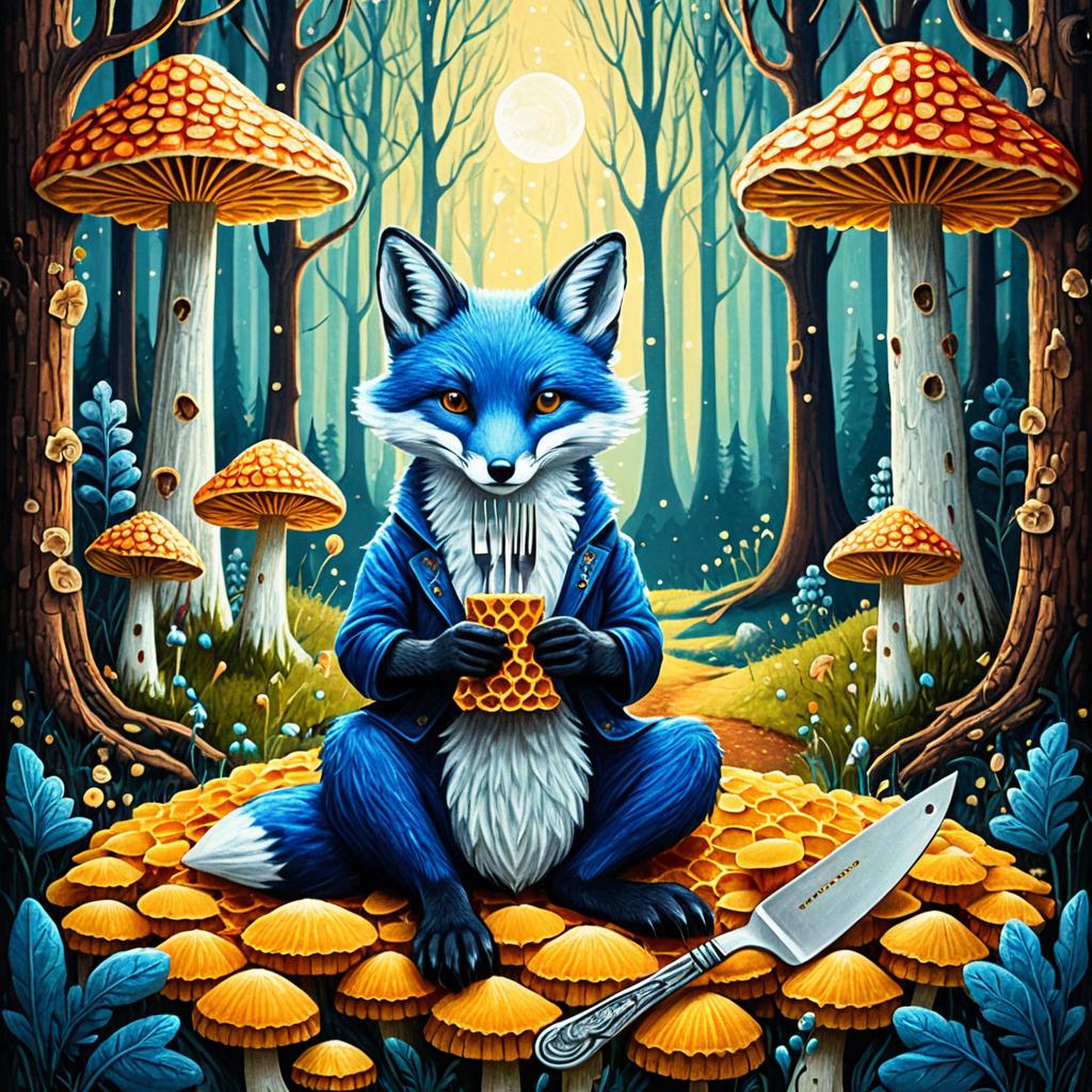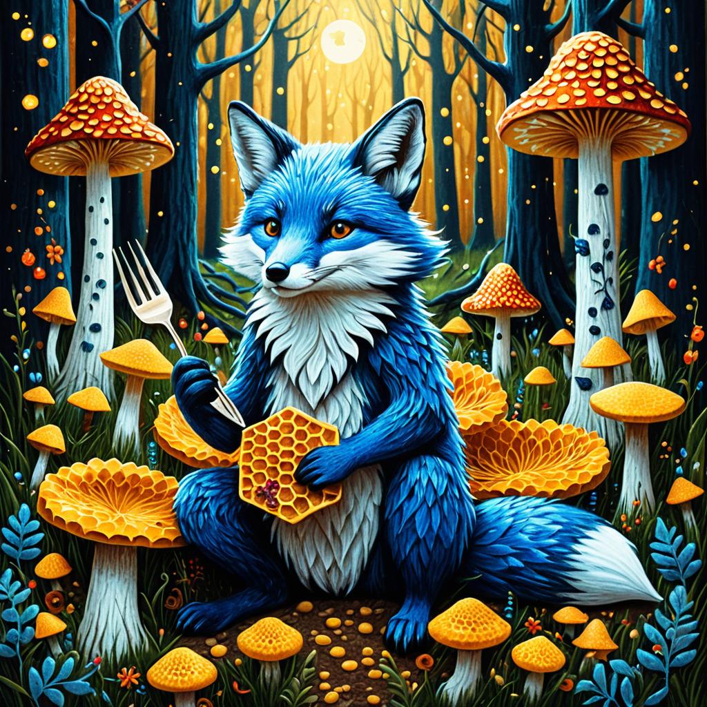 An illustration of a whimsical blue fox seated in an enchanted forest clearing beneath towering, glowing mushrooms, holding a tiny fork and knife over a plump golden honeycomb, rendered in bright bold colors with folk art style, textured brushstrokes and naïve simple shapes for vivid complementary contrast.