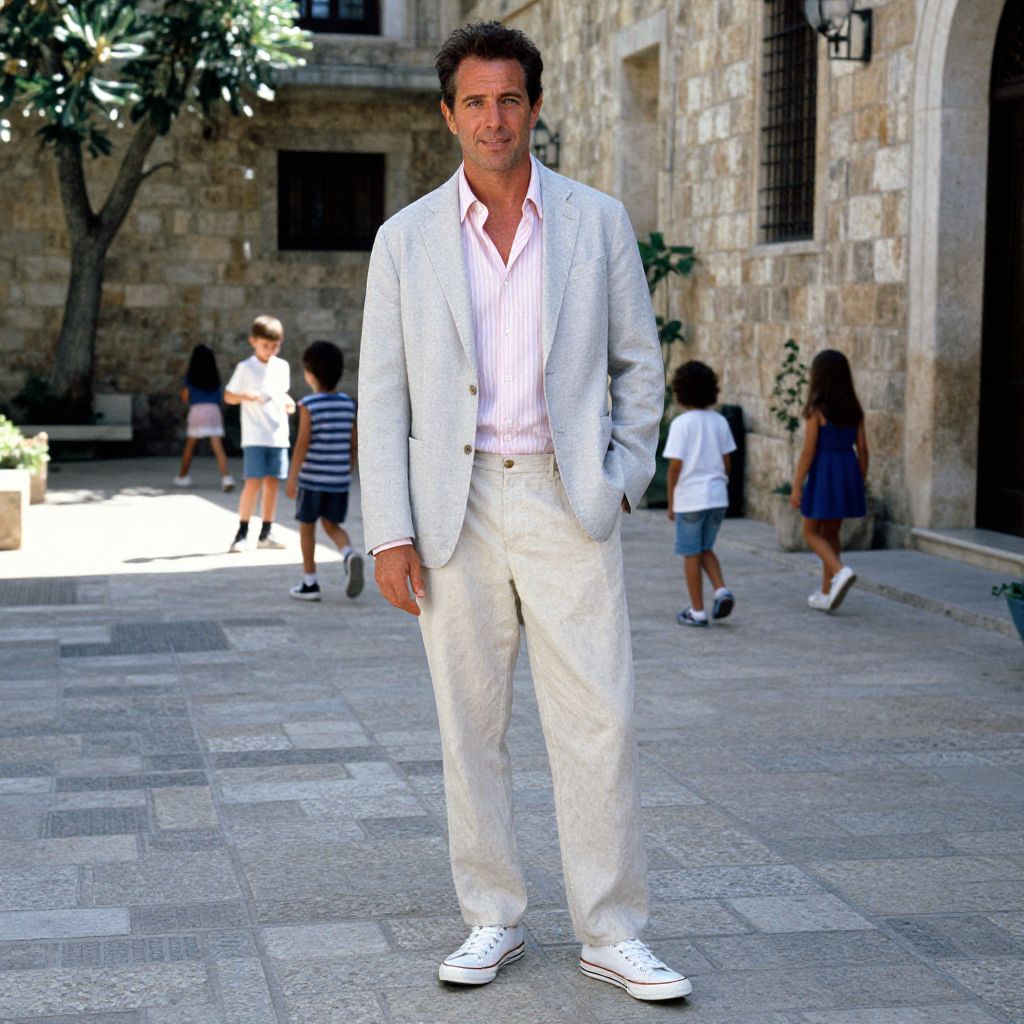 A man, light gray blazer, pastel pink striped shirt, cream khaki pants, white canvas sneakers, linen fabric, sun-drenched courtyards, ancient stone walls, children playing in the streets, Ilford film stock, relaxed smile, casual confidence. Man has masculine face and piercing eyes