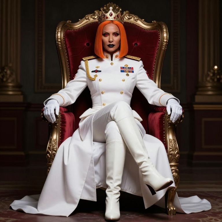 Female Military Queen in White Uniform on Throne