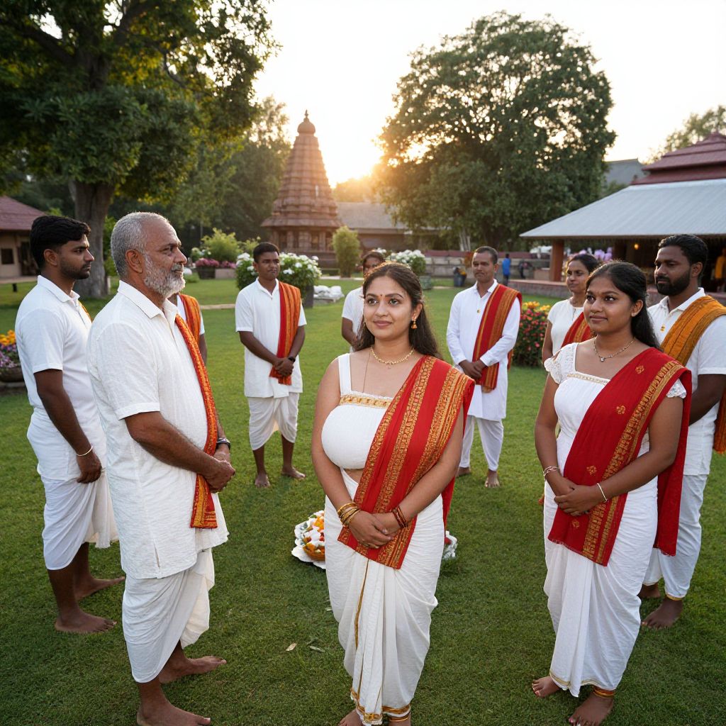 Photograph of a traditional Hindu wedding ceremony in an outdoor grassy area at sunset. Central focus is on a bride with long dark hair, wearing a white traditional saree with a red and gold border, holding a small bouquet of flowers. She stands beside a groom, also in white attire with a red and gold dhoti. Surrounding them are male and female relatives, all in white with red and gold borders, standing in a semi-circle. The background features lush green trees, a temple with a spire, and a white tent. The sun is setting, casting a warm glow.