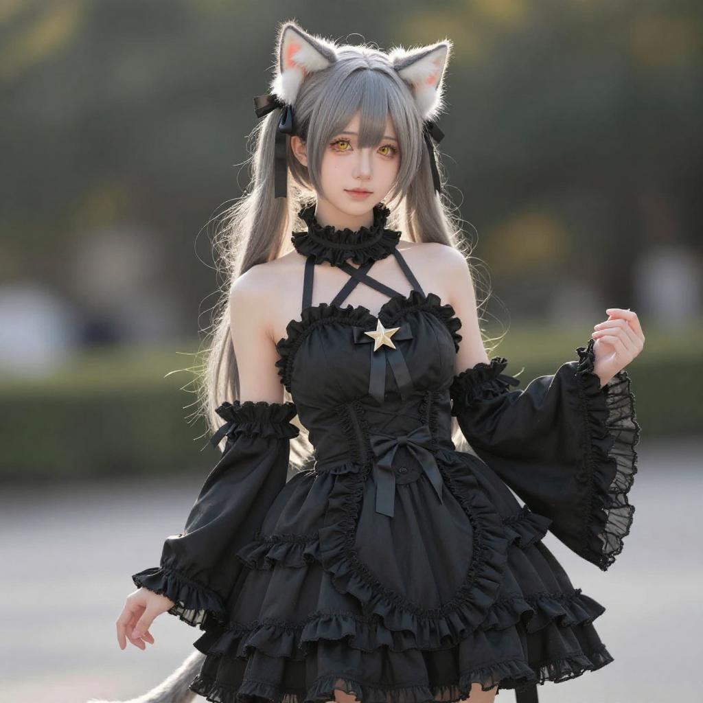 Photo-realistic cosplay photo of person standing in murasaki shion (gothic lolita) costume. 1girl, cat girl, cat ears, animal ear fluff, cat tail, yellow eyes, short eyebrows, grey hair, long hair, twintails, arched bangs, sidelocks, hair ribbon, black dress, halter dress, frilled dress, sleeveless dress, bare shoulders, detached sleeves, frilled choker, frilled ribbon, black sleeves, wide sleeves, juliet sleeves, virtual youtuber, virtual youtuber, gothic lolita, star brooch, criss-cross halterfull body shot. lifestyle stock photo, shallow depth of field, lifestyle stock photography, shallow depth of field, natural lighting, warm tones, soft background blur, vibrant colors, realistic textures, professional photoshoot