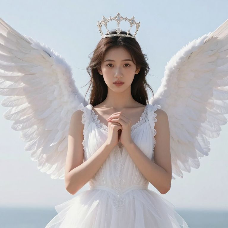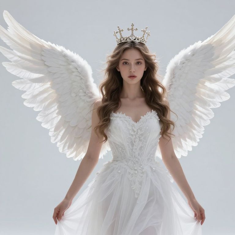Female angel with white wings and a crown on her head.