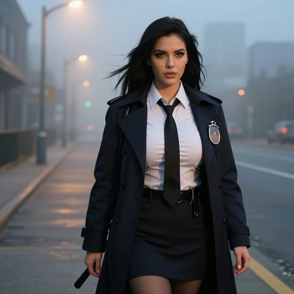 Photorealistic digital image of a strong, confident woman with long, black hair and dark eyes. She wears a black police uniform consisting of a long coat, white shirt, black tie, and black skirt. A police badge is on the left side of her chest. She stands on a foggy, deserted street at dusk, with blurred streetlights and buildings in the background. The street is wet, reflecting light, and cars are faintly visible. Her expression is serious, and she holds a baton in her right hand. The overall mood is gritty and intense.