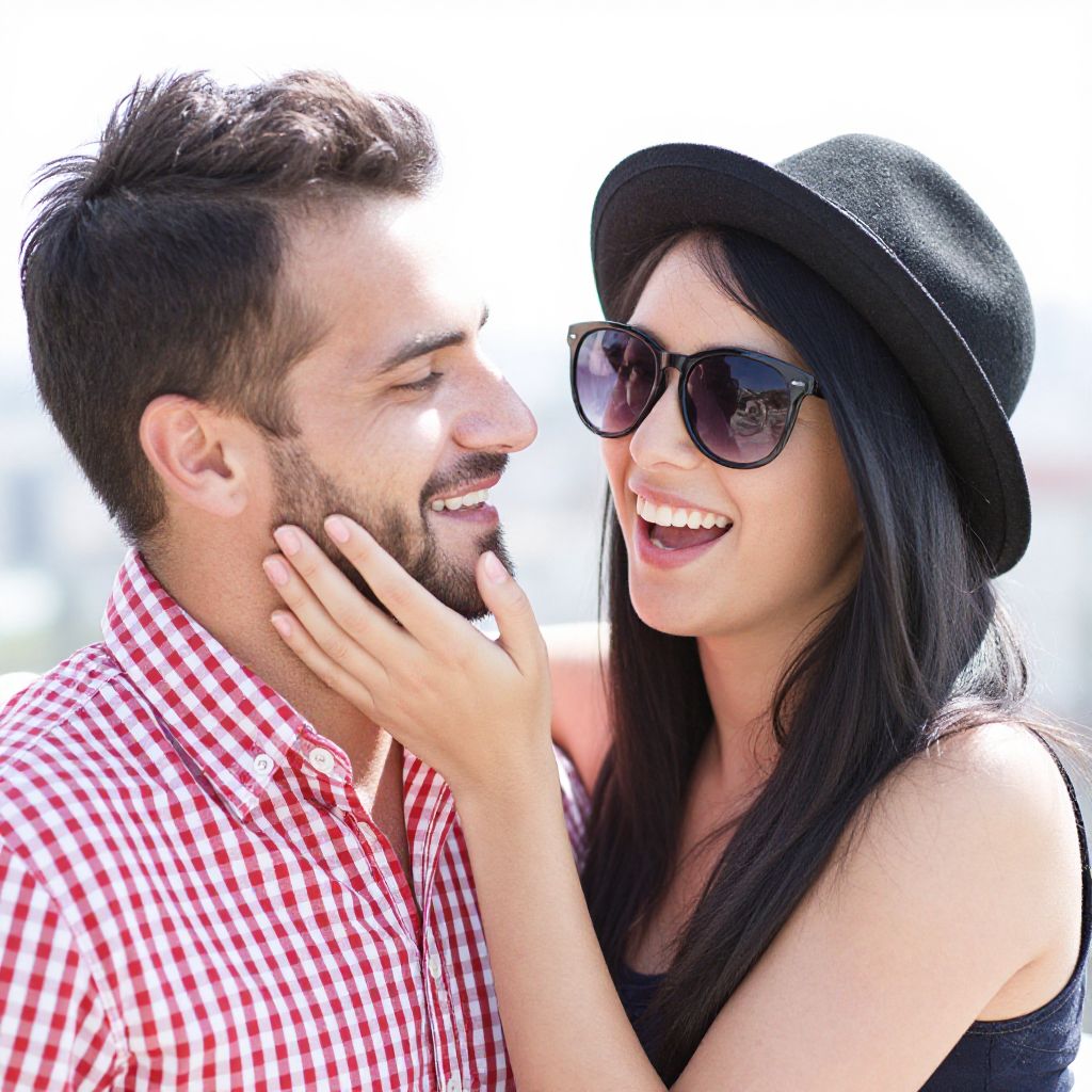 A sunny, slightly overexposed photograph of a smiling couple. The man has dark hair, a beard, and is wearing a red and white checkered shirt. The woman with long black hair is wearing a black hat and sunglasses, playfully touching his cheek. They're both looking at each other, exuding a happy, relaxed vibe. The background is bright and slightly blurred.