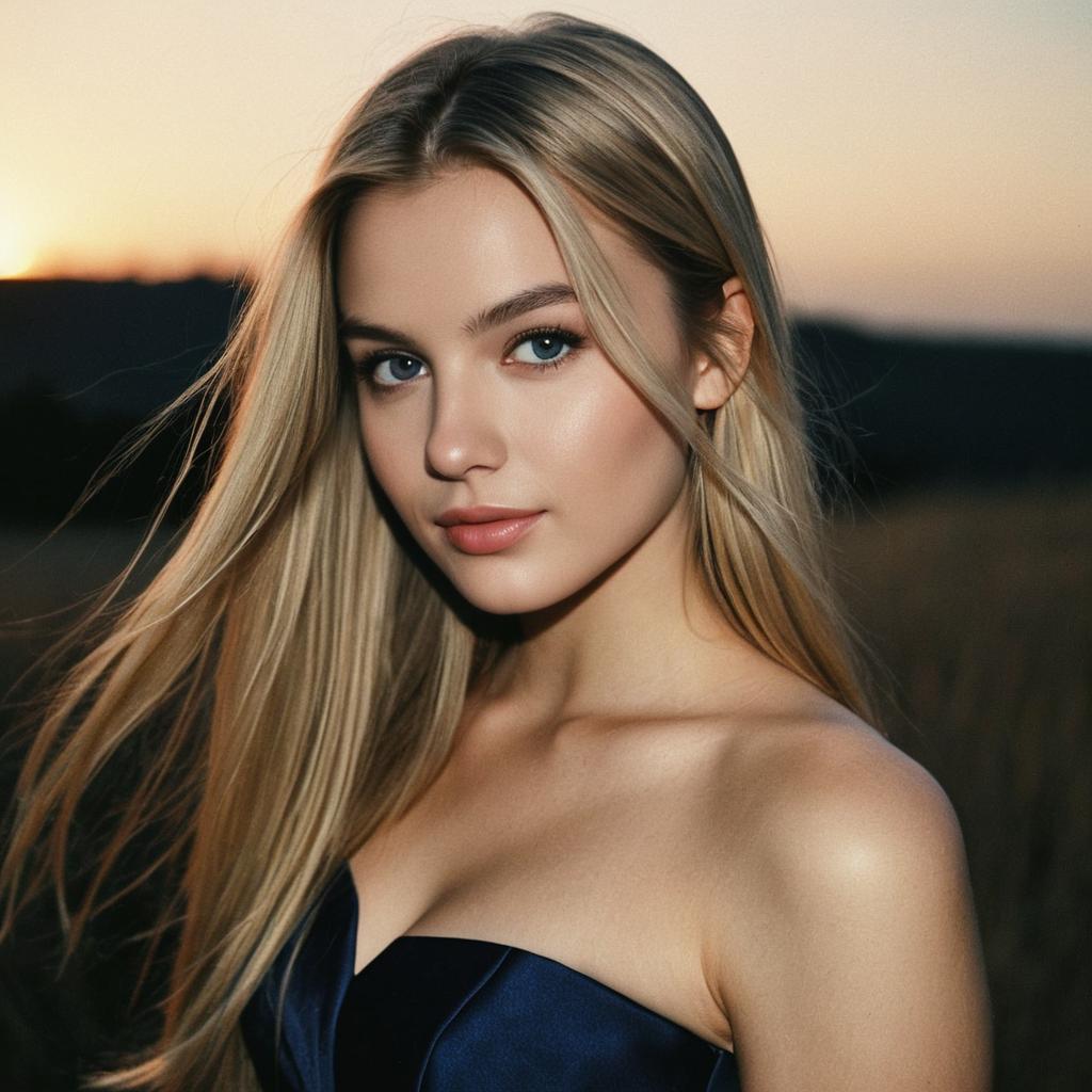 A realistic portrait of a young woman with long straight blonde hair and striking eyes, wearing a strapless navy blue evening dress, moody soft lighting accentuating smooth skin texture, warm brown and beige colors, detailed facial features, outdoor sunset background