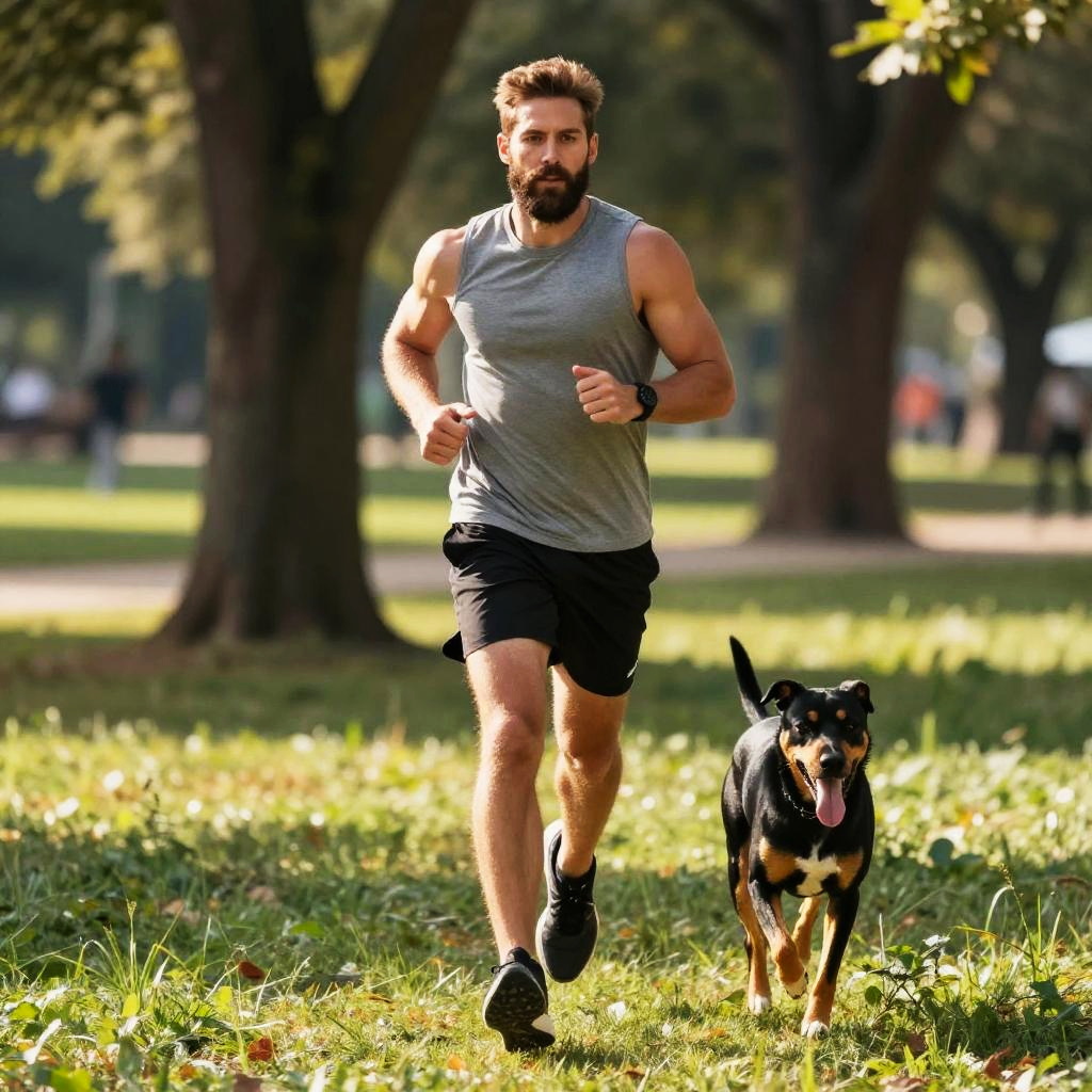 Photograph of a muscular bearded man jogging in a park, wearing a gray sleeveless shirt and black shorts, with a black and tan dog running