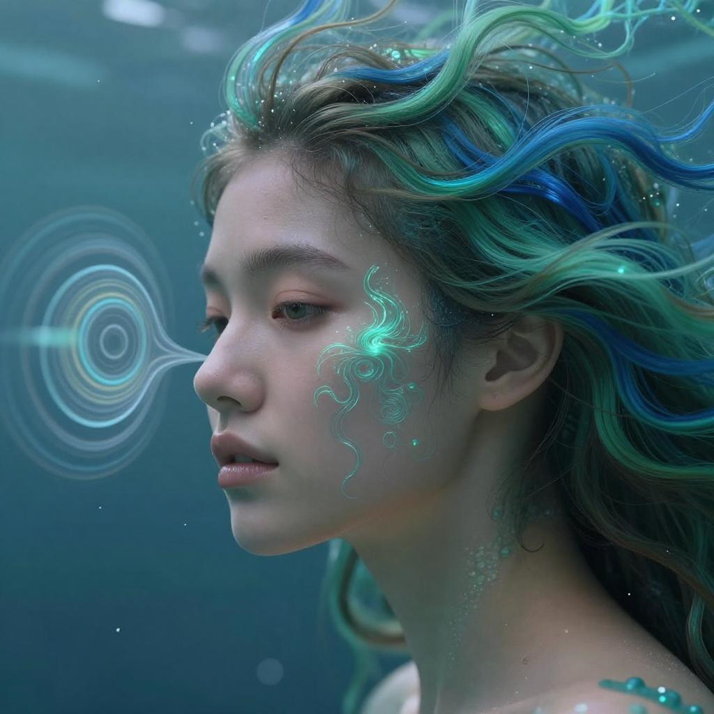 Realistic photo.Close-up illustration of a mermaid's face with flowing sea green and blue hair and magical glowing soundwaves, symbolizing conscious awakening. Intricate details, dreamlike atmosphere, surreal 'dream within a dream' aesthetic realistic photo