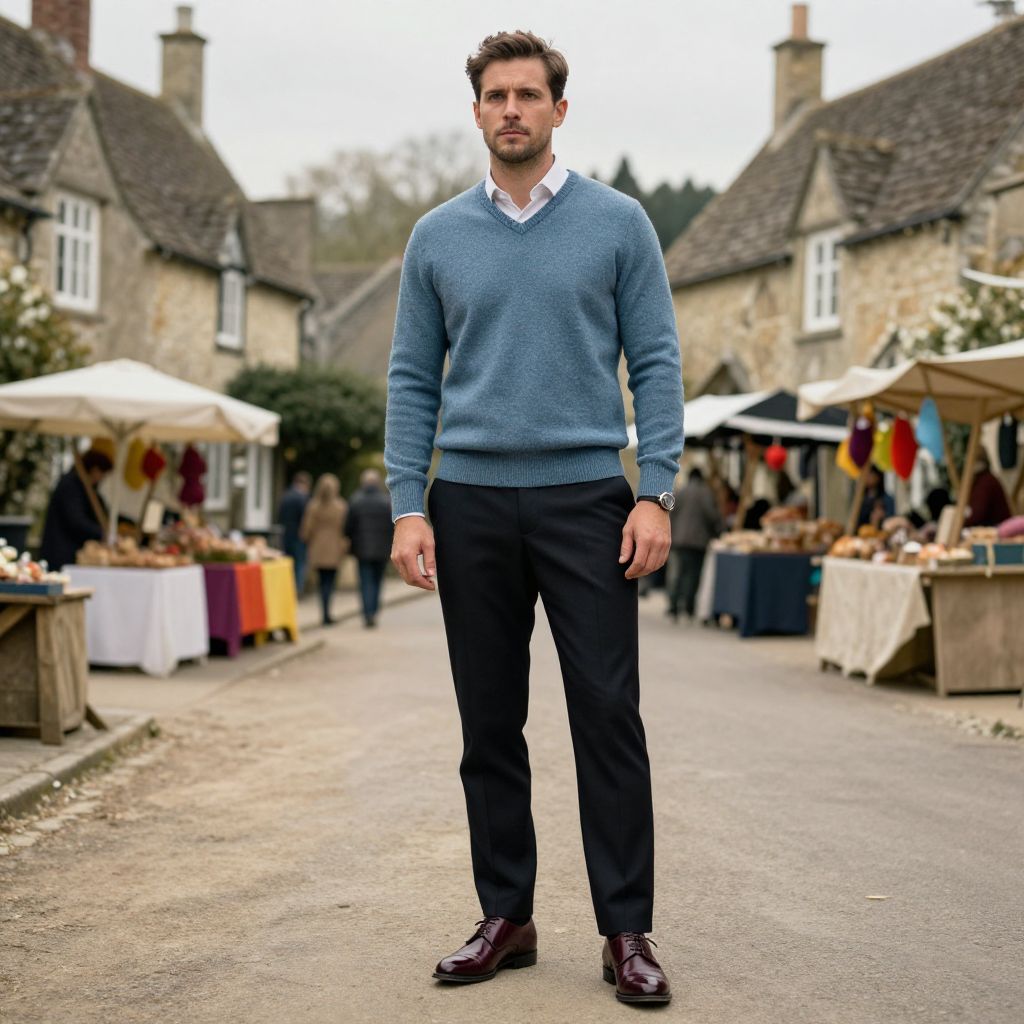 Photograph of a tall, handsome Caucasian man with short, dark brown hair and a trimmed beard, standing in a quaint, outdoor market. He is wearing a light blue V-neck sweater over a white dress shirt, black trousers, and polished brown shoes. The background features rustic stone cottages with steep roofs, market stalls with colorful tablecloths, and blurred market-goers. The scene is brightly lit with natural light, and the overall atmosphere is charming and bustling. The man's expression is neutral, and he stands confidently in the center of the image.