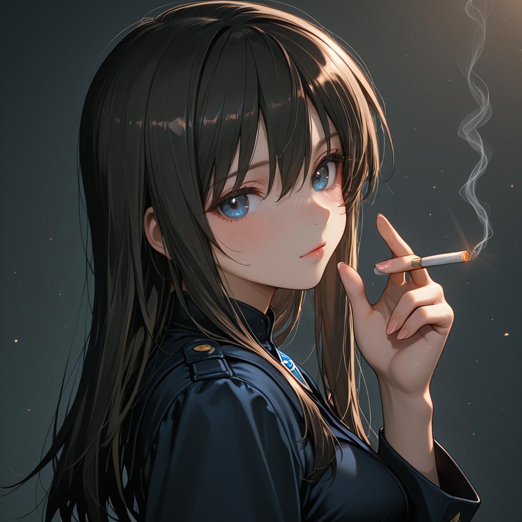 Detailed anime-style portrait of a young girl with long dark brown to black hair and bright blue eyes, holding a lit cigarette. She wears a dark jacket with a high collar, illuminated softly against a dark background. The image conveys a moody, contemplative atmosphere with subtle lighting and smoke details.