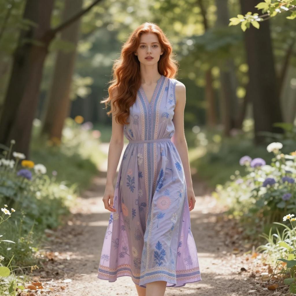 Funny fancy dress theme, photorealistic portrait of a red-haired woman, standing on a garden path, wearing a colorful floral dress with orange and blue patterns, pink cherry blossom tree in background, sunlight filtering through trees, summer day, greenery, flowers on the path, soft light, confident expression, curly hair, medium build, slender, natural makeup, slightly lifted dress hem, warm colors, realistic ures, background blurred, realistic style, nature setting, outdoor photography, daytime