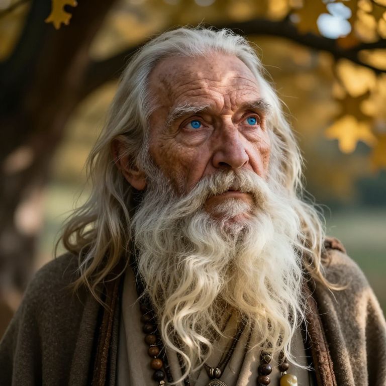 A highly detailed photorealistic portrait photograph showcases a wise old sage with mesmerizing blue eyes and weathered skin, his long white beard adorned with trinkets. From an intriguing bug's-eye view perspective, the sage exudes wisdom and tranquility as he gazes thoughtfully into the distance. Soft golden light filters through ancient oak branches, casting elongated shadows that accentuate his furrowed features, creating an air of mystery and introspection.