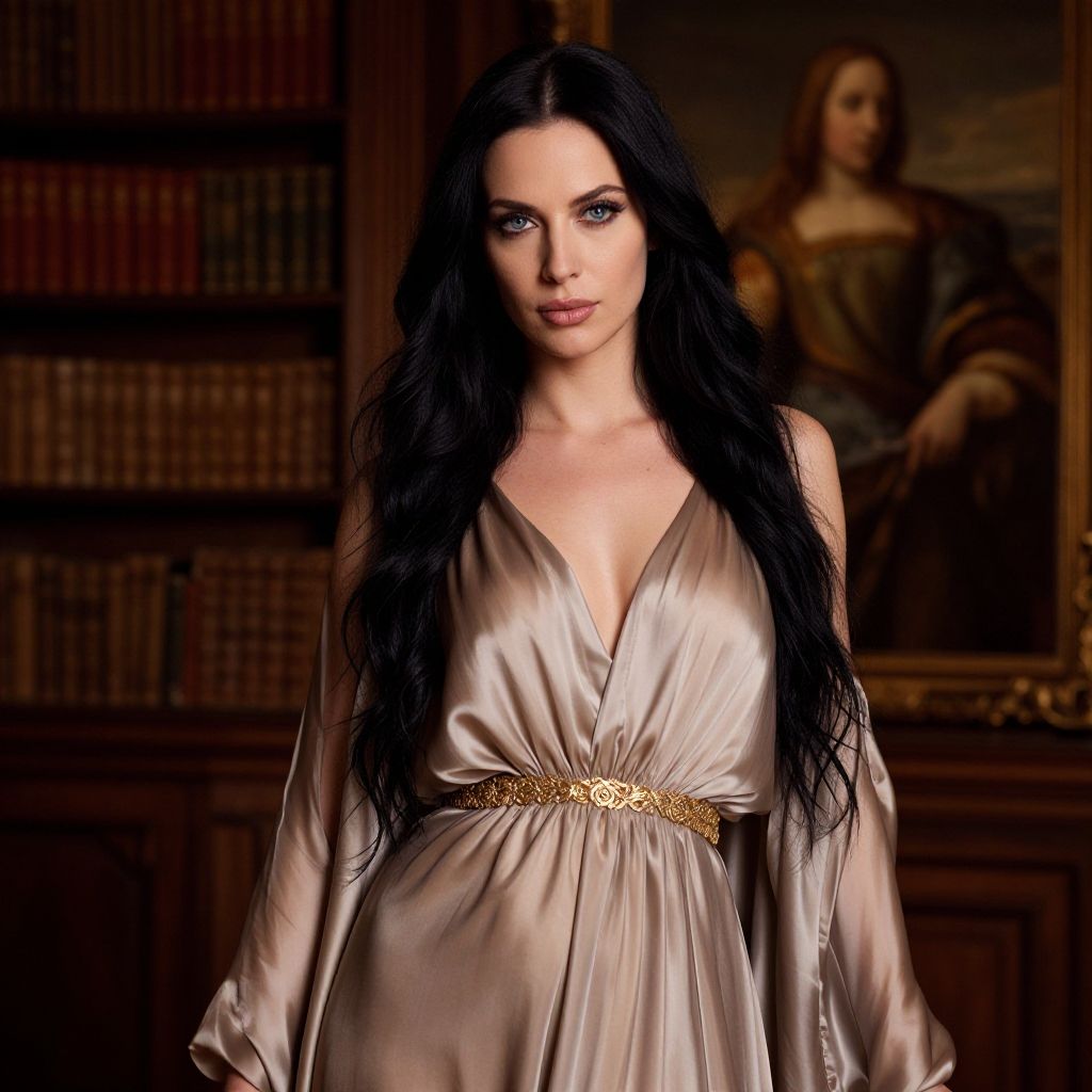 Elegant woman with long black hair and intense blue eyes wearing a flowing silk dress, antique library background, warm ambient lighting, Renaissance-inspired art, intricate details