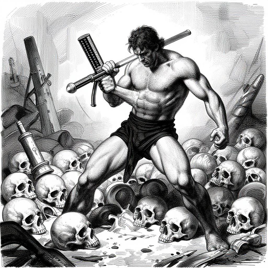 Gustave Dore athletic man beats a pile of skulls, movie shot, cinematic, ominous, apocalyptic, haunting, vantablack, Line art black ink sketch, ultra detailed, style by Alberto Vargas, 4k,