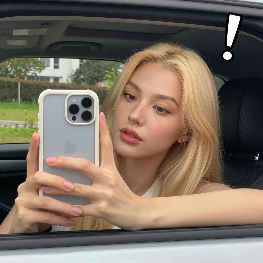 Woman with blonde hair takes a selfie through a car window. She is leaning forward with her face partially visible, eyes looking at the camera. She holds a grey iPhone with a white case in her left hand. The car window frame is black. Background includes greenery and a white building. Exclamation mark in the top right corner.