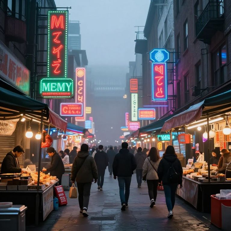 Memw at a bustling urban street market, neon signs glowing in the evening fog, vibrant colors, detailed textures, a surreal blend of futuristic and traditional elements, cinematic lighting, ultra-realistic style