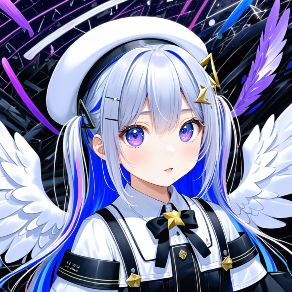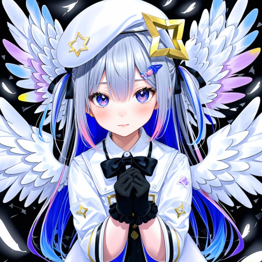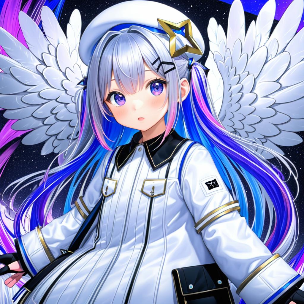 Digital illustration of a young anime girl with long blue, grey, and pink streaked hair, styled in asymmetrical bangs and two side ponytails. She has purple eyes and wears a white beret with a golden star-shaped halo, a white jacket with black and gold accents, and black fingerless gloves. Large white feathered angel wings extend behind her against a starry night background, creating a celestial appearance. The image is inspired by virtual YouTuber art style and features detailed anime elements.