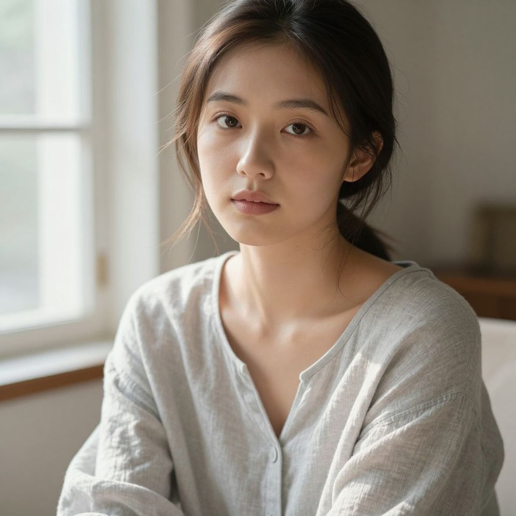 Photograph of an East Asian woman with long, wavy black hair and fair skin, gazing thoughtfully out a window. She wears a white, sleeveless top and small, delicate earrings. The window frame is partially obscured by floral-patterned curtains in red and green. Soft sunlight filters through the curtain, illuminating her face and creating a gentle, dreamy atmosphere. The blurred greenery outside the window contrasts with the indoor setting. Her expression is introspective, with slightly parted lips and a soft, natural makeup look.
